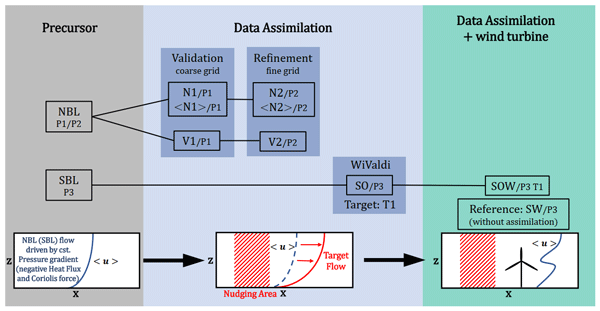 It is crucial to understand the loads and power production of wind turbines under different atmospheric situations (e.g., night and day changes). Computational simulations are a widely used tool to get more knowledge of the performance and the wake of wind turbines. In this study realistic velocity profiles of the atmosphere are used as input for simulations so that these simulations become more realistic. The generated flow is used as inflow for wind turbine simulations.
