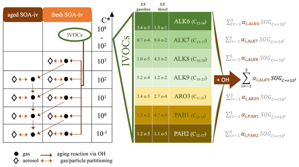 The chemistry scheme of the atmospheric box model CAABA/MECCA is expanded to achieve an improved aerosol formation from emitted organic compounds. In addition to newly added reactions, temperature-dependent partitioning of all new species between the gas and aqueous phases is estimated and included in the pre-existing scheme. Sensitivity runs show an overestimation of key compounds from isoprene, which can be explained by a lack of aqueous-phase degradation reactions and box model limitations.