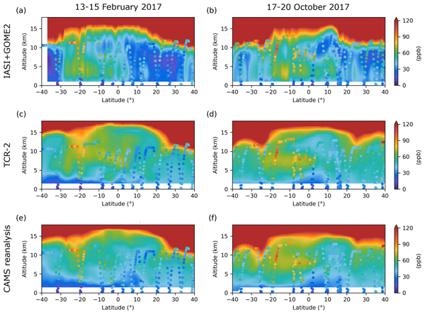 We analyse the distribution of tropospheric ozone over the Atlantic during February and October 2017 using a multispectral satellite synergism called IASI+GOME2, two chemistry reanalysis products and in situ airborne measurements. It reveals that a significant overestimation of two chemistry reanalysis products of lowermost troposphere ozone over the Atlantic in the Northern Hemisphere due to the overestimations of ozone precursors from anthropogenic sources from North America.