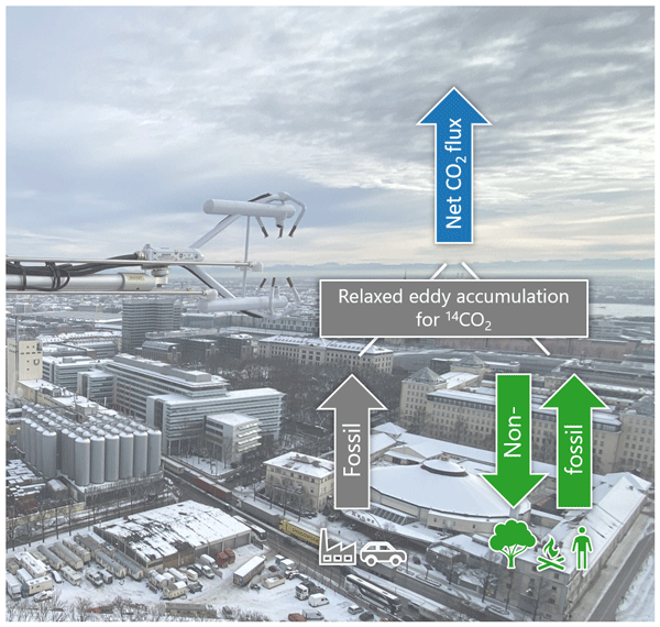 We present radiocarbon (14C)-based fossil fuel CO2 fluxes from relaxed eddy accumulation measurements on tall towers in the cities of Zurich, Paris, and Munich. By separating net CO2 fluxes into fossil and non-fossil components, these data reveal significant and variable contributions from human, plant, and soil respiration, as well as point-source emissions. These unique insights into CO2 flux composition offer crucial information for observation-based validation of urban emission estimates.