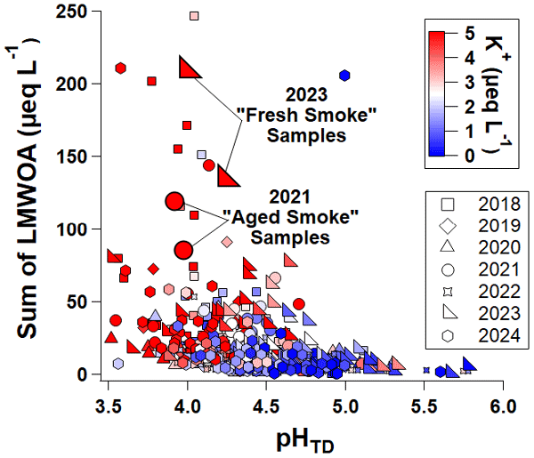 We present seven years of cloud water measurements from the summit of Whiteface Mountain in upstate New York to evaluate how organic acids affect cloud droplet acidity in the summer. Sources of these acids, ranging from local biogenic emissions to long-range wildfire smoke plumes, play a major role in reshaping the cloud chemistry of this remote region, which was once controlled mainly by industrial pollution.