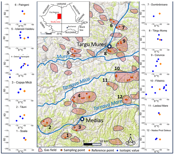 We report the isotopic composition of CH4 emitted from 48 installations in the gas production region of Transylvania, Romania which confirm the biogenic origin of the Transylvanian gas, produced by hydrogenotrophic CO2 reduction. This is similar to values reported previously from natural seeps and natural gas in a major city in the region. However, is more depleted in heavy isotopes than the oil-associated gas emitted in the Southern Romanian Plain, and gas leakages in the city of Bucharest.