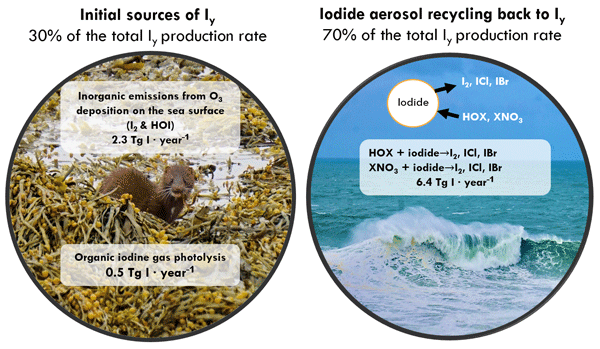 Global chemical transport models previously treated aerosols as a sink for reactive iodine (Iy); however, aerosol iodide is also a source of Iy via heterogeneous reactions involving hypohalous acids and halogen nitrates. We implemented this chemistry into GEOS-Chem, in addition to explicitly representing three aerosol iodine types: soluble organic iodine (SOI), iodide, and iodate. We found that aerosol recycling of iodide to form Iy is more than twice as fast as the other Iy sources combined.