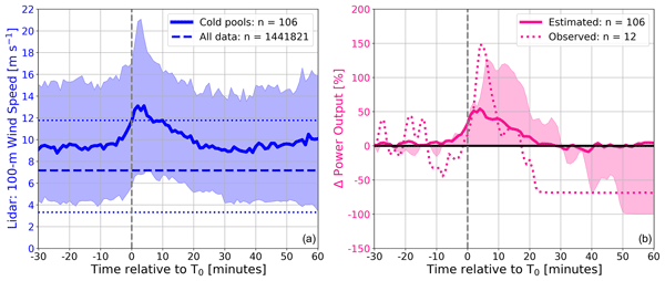 With increasing wind energy in the German energy grid, it is crucial to better understand how different types of weather (including thunderstorms) can impact wind turbines and the surrounding atmosphere. We find rapid wind changes associated with the leading edge of thunderstorm outflows within the height range of wind turbines that would quickly increase wind power output, with longer-lasting changes in the near-surface atmosphere that would affect subsequent wind turbine operations.