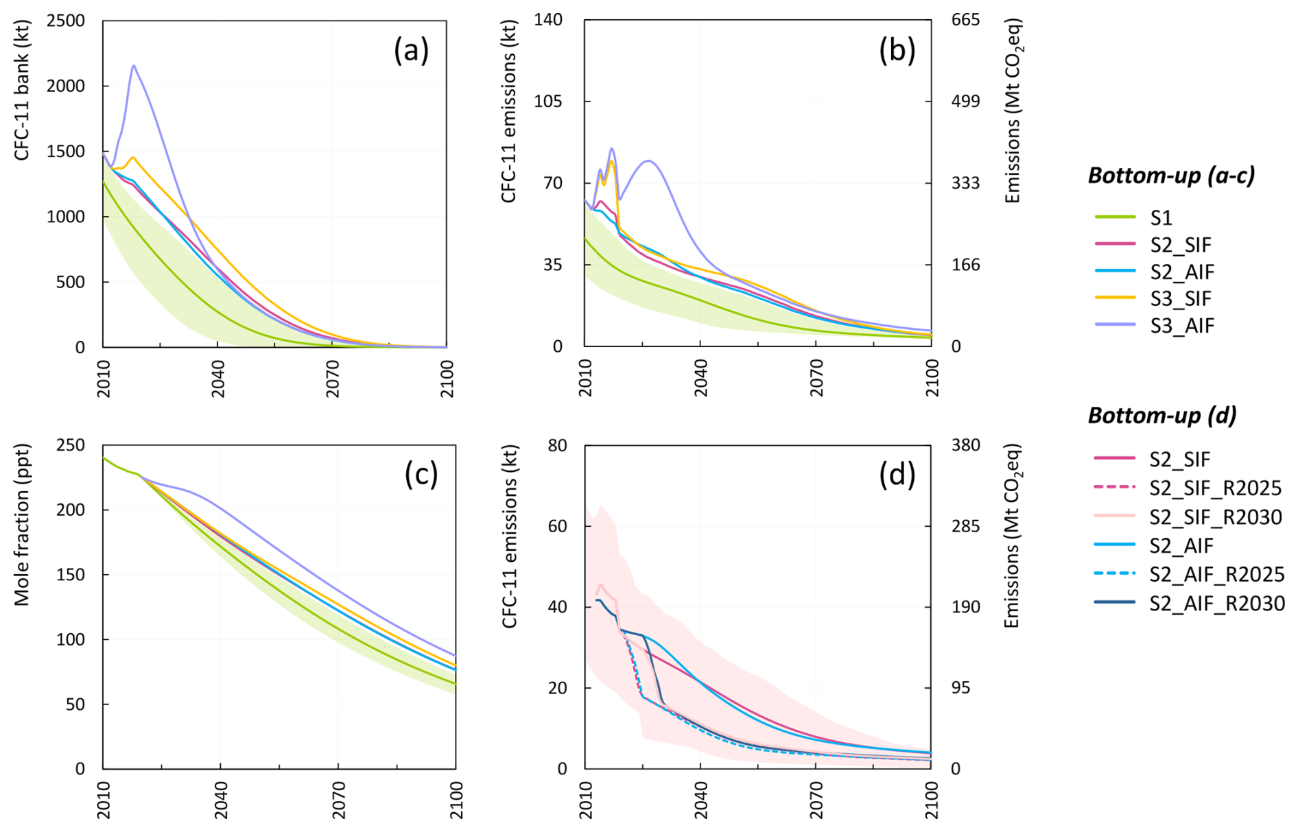 Under S2, unreported production totaled 135 kt during 2013–2018, increasing the 2019 bank by up to 120 (70–130) kt (S2_SIF) and 90 (75–105) kt (S2_AIF). These values are slightly higher than estimated 75 (46–112) kt for China but lower than TEAP assessments of 320–700 kt (Park, et al., 2021; TEAP, 2021). By 2030, this bank increase declines to 75 (45–90) kt (S2_SIF) and 45 (0–105) kt (S2_AIF), falling further to 40 (0–75) kt and 1 (0–15) kt by 2050. Unreported production under S2_SIF may have increased emissions by 7 (4–13) kt during 2014–2018. Cumulative global emissions for 2025–2100 could reach 980 (600–1500) kt, equivalent to 4.7 (2.9–7.1) Gt CO2.