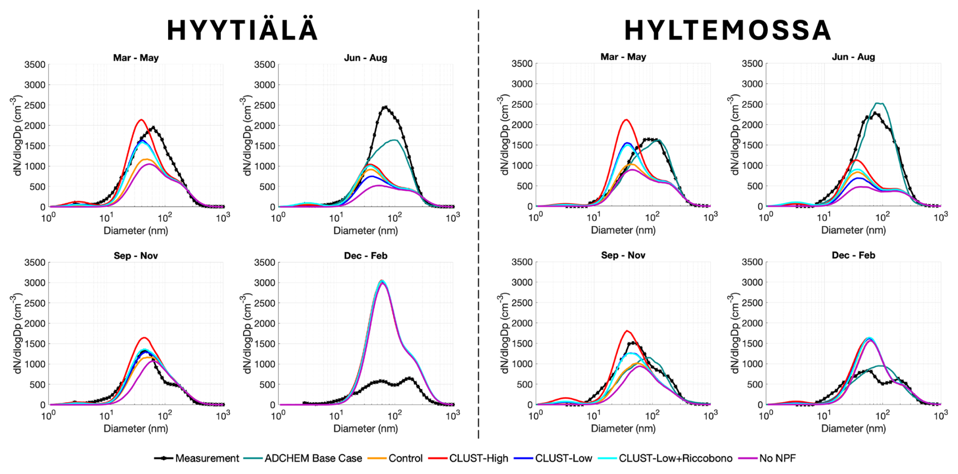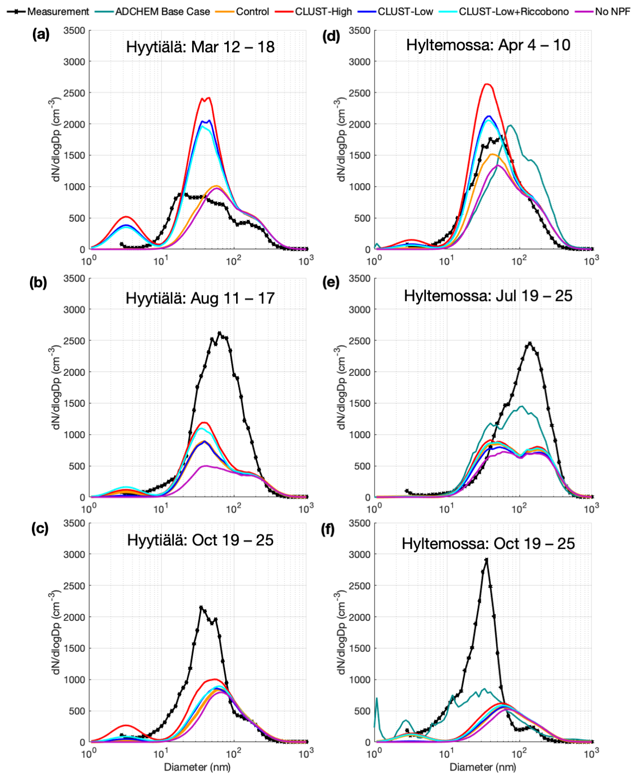 The differences between the modelled and measured PNSDs are presented in this section, categorized by seasonal and weekly periods for the year 2018. The seasonal median PNSDs for the observations and models at the two stations are shown in Fig. 1. The measured PNSDs at the two stations, Hyytiälä and Hyltemossa, display a comparable seasonal variability, with lower aerosol number concentrations during winter and peak concentrations in summer. At both stations, the five EC-Earth3 cases and ADCHEM underestimate aerosol number concentrations in summer (June to August) and overestimate them in winter (December to February). When comparing the seasonal PNSDs from EC-Earth3 and ADCHEM with the measurements, the ADCHEM model shows substantially better performance. EC-Earth3's median aerosol number concentrations for winter, which are driven by primary aerosol emissions, are highly overestimated at both stations (shown in Fig. 1), as is also clear based on the overestimation in the no-NPF simulation. Peculiarly, the overestimation by EC-Earth during winter is much stronger at Hyytiälä than at Hyltemossa. In springtime, at both stations, the EC-Earth3 simulations have the highest disparity between model runs for the different NPF schemes. At such boreal conditions, springtime is favourable to nucleation, as the period is photochemically active but temperatures are not too high. The default ELVOC–H2SO4 (Riccobono) nucleation depends on biogenic emission from vegetation and the NPF is significantly lower in the control case during spring before the initiated growing season. Conversely, agricultural NH3 emissions peak in spring, due to the application of fertilizers. The inclusion of NH3–H2SO4 nucleation in spring, as modelled by the CLUST scheme cases, improves the agreement between the model and observations during this period. Shown in the hourly distributions and the seasonal median (Figs. 1 and 3), the model’s ability to capture NPF days is improved, and the results show more accurate magnitudes of the nucleation events and subsequent Aitken-mode number concentrations.