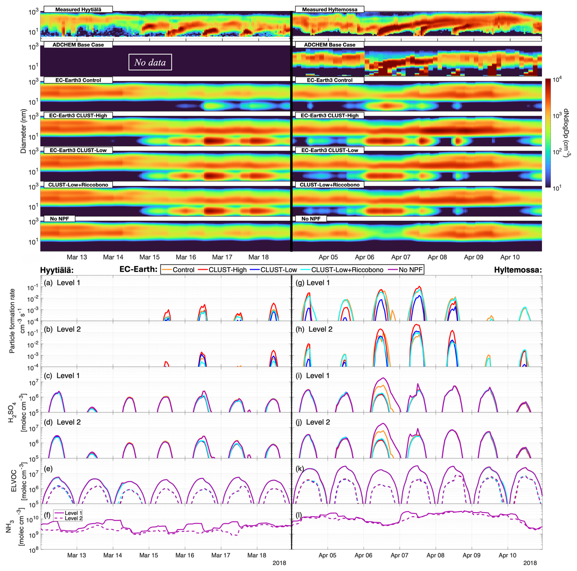 Figure 3The top two figures show the surface aerosol number size distribution over the springtime for the five modelled EC-Earth3 cases, with the DMPS measured aerosols at Hyytiälä and Hyltemossa. ADCHEM simulations have no available hourly data outside the summer months for Hyytiälä. The bottom section shows EC-Earth3 modelled layer 1 and layer 2 Hyytiälä and Hyltemossa springtime cases: (a, b, g, h) daily maximum particle formation rate, (c, d, i, j) H2SO4, (e, k) ELVOC, (f, l) NH3 gas concentration. The concentrations for ELVOC and NH3 level 2 are shown as dotted lines in (e, f, k, l). The missing particle formation rates below 10−4 in (a, b, g, h) are considered to be practically zero.