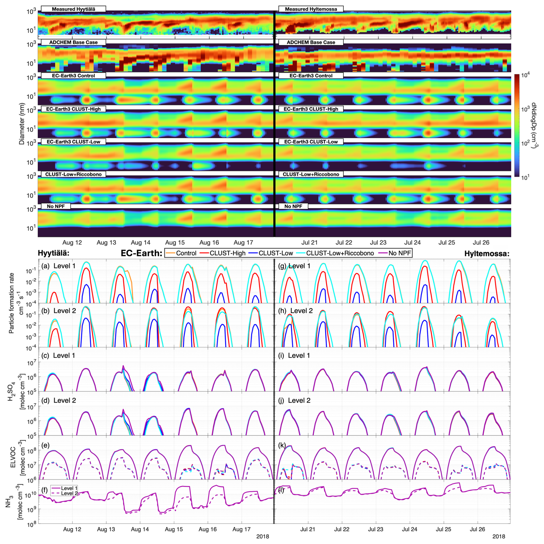 We evaluate an additional 2 weeks for the summer period at Hyltemossa and Hyytiälä (Fig. 4). This shows large underestimations in EC-Earth3 (all cases) for NPF magnitude and growth. The control case with ELVOC–H2SO4 results in higher particle formation rates (compared with CLUST) at the surface during this period at both locations, as shown in Fig. 4a and g. Despite the higher surface formation rates for ELVOC–H2SO4 nucleation during these days, this case still yields a lower total surface aerosol number concentration, compared with the CLUST-High case, as shown in Fig. A8b and e. The particles produced in overlying and neighbouring grids for CLUST-High are probably responsible for the resulting higher median summer surface concentrations here. Similar to the hourly results in Fig. 3, the CLUST annual median particle formation rates given in Fig. A1 show significantly higher particle production in the second model layer, compared with the surface layer.
