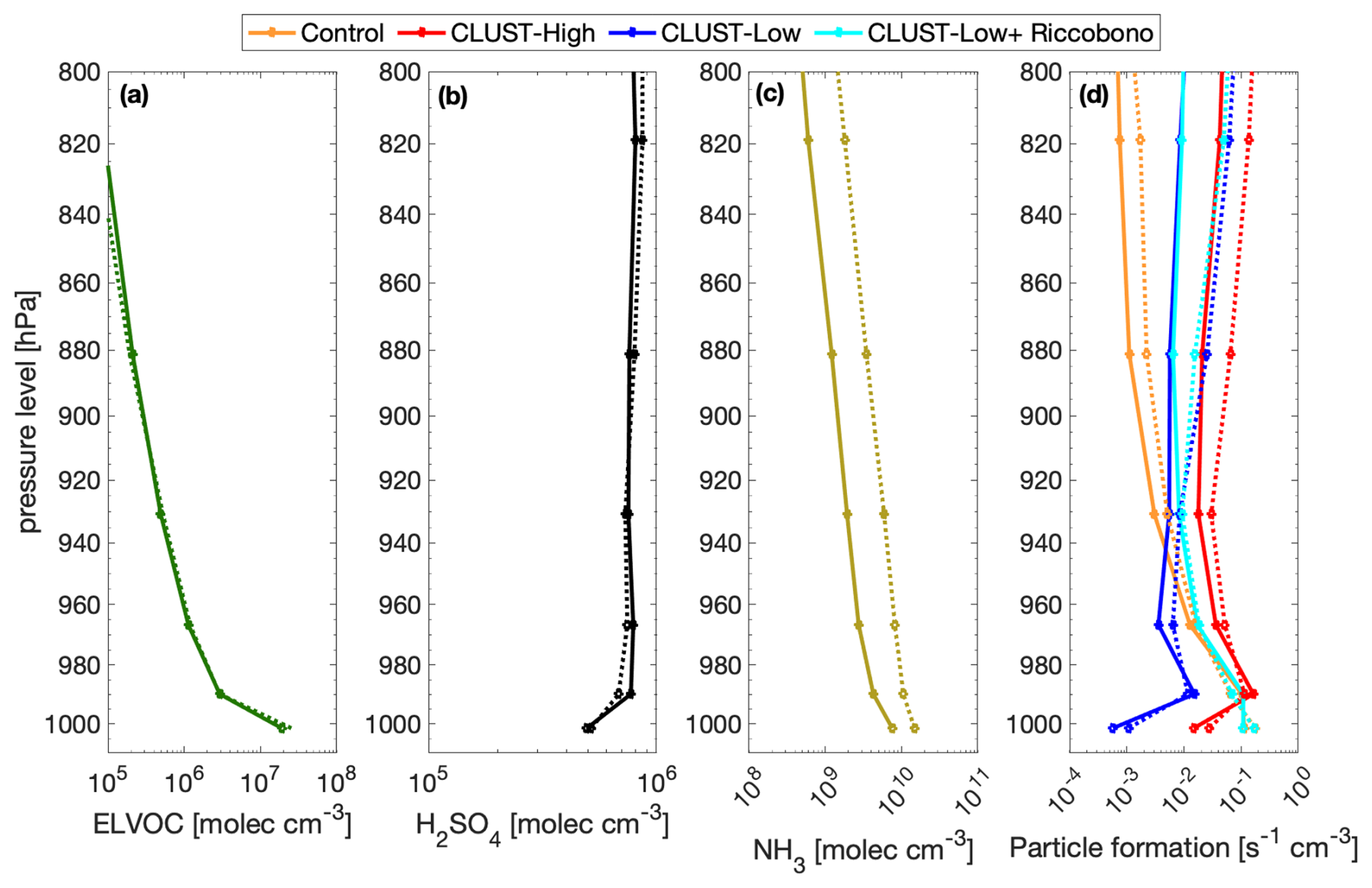 Figure 2EC-Earth3's modelled annual mean vertical precursor: (a) ELVOC, (b) H2SO4, and (c) NH3 concentrations; (d) 95th percentile of particle formation rate for 2018. The bold line represents Hyytiälä station and the dotted line represents Hyltemossa station. The gas concentrations in (a)–(c) are from the no-NPF case; the median differences between EC-Earth3 model cases would not be visible in this figure.