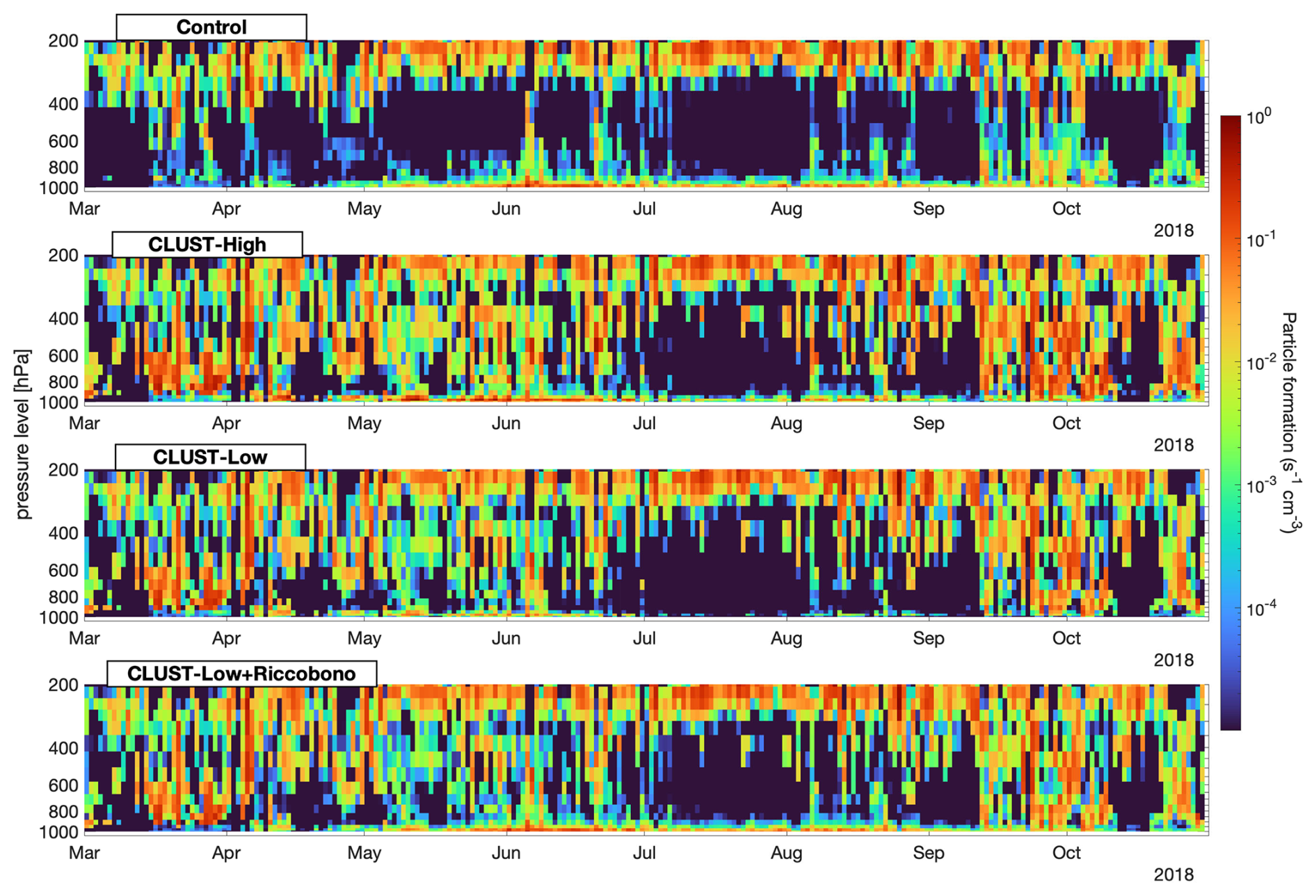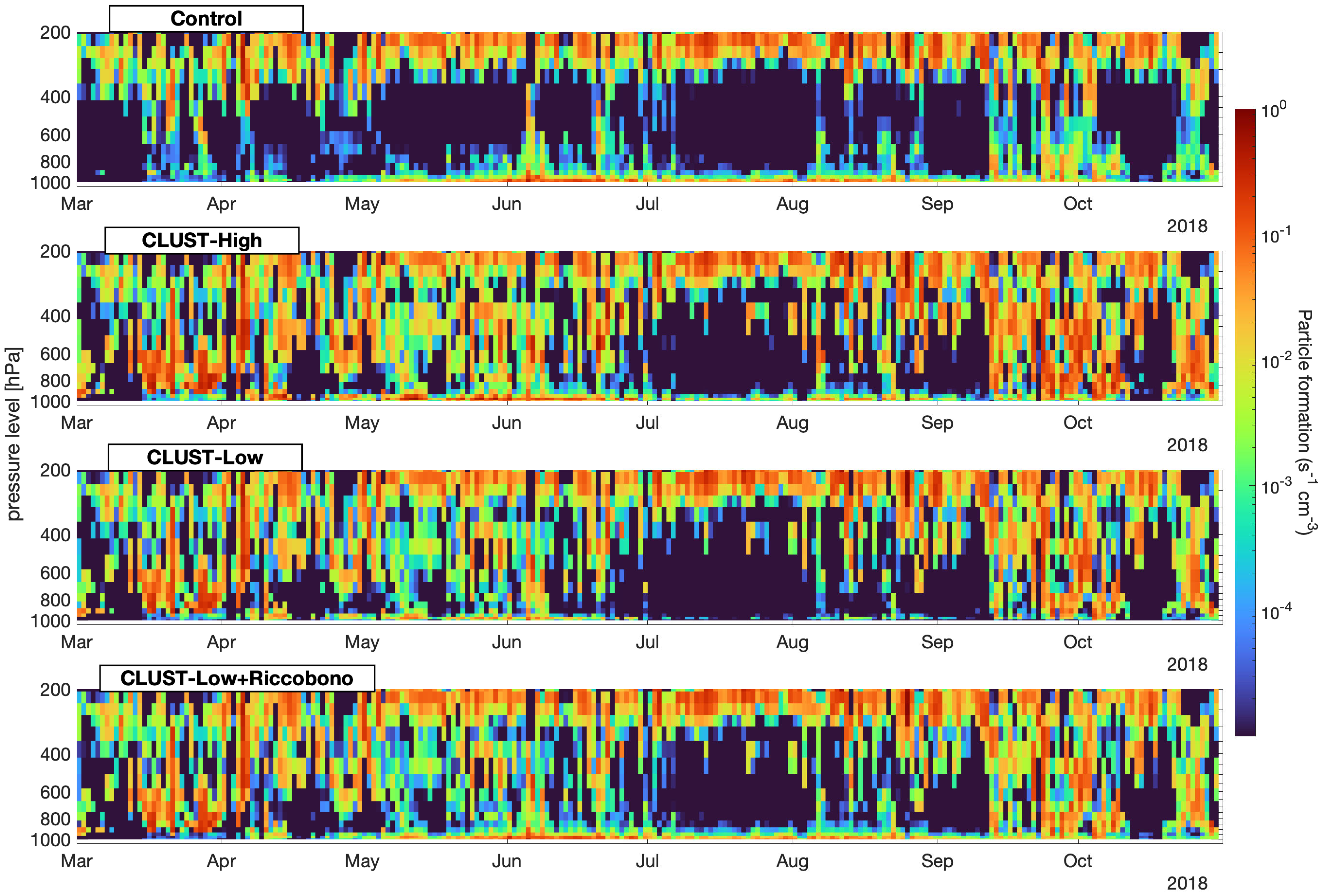 Figure A2Vertical distribution of daily mean particle formation rates in the four EC-Earth3 cases at Hyytiälä for 2018, March to October.