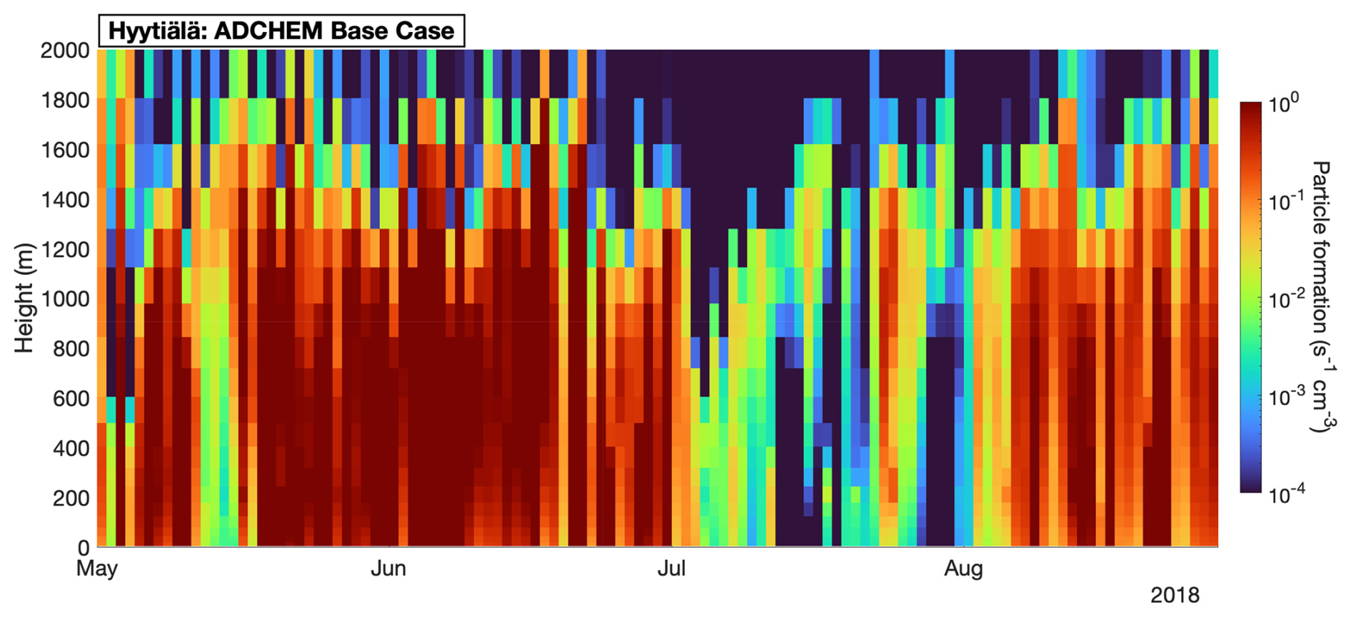 Figure A3Vertical distribution of daily mean particle formation rates in ADCHEM Base Case at Hyytiälä 2018, May to August.