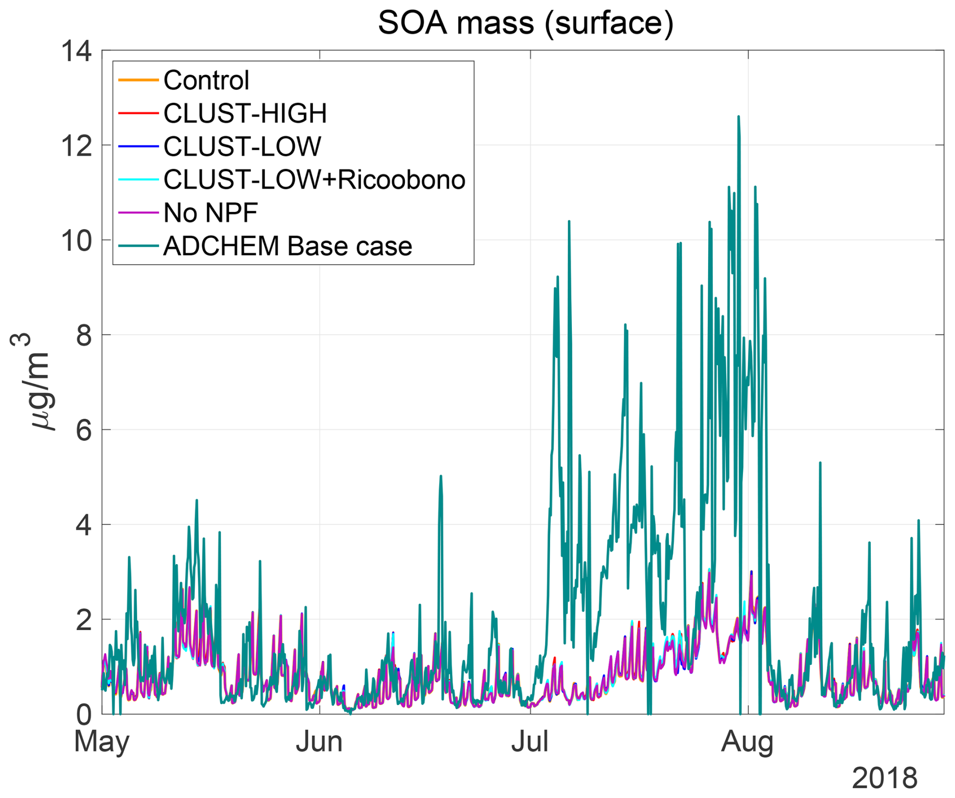 Figure A4Modelled mass concentration of particulate organic matter (SOA) for EC-Earth3 cases and ADCHEM at Hyytiälä 2018, May to August.