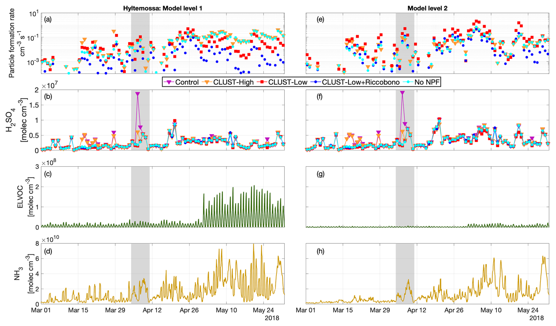 Figure A5EC-Earth3 modelled layer 1 and layer 2 Hyytiälä springtime: (a) daily maximum particle formation rate, (b) H2SO4, (c) no-NPF case for ELVOC, (d) no-NPF case for NH3 gas concentration. Shaded areas represent the studied weekly cases.