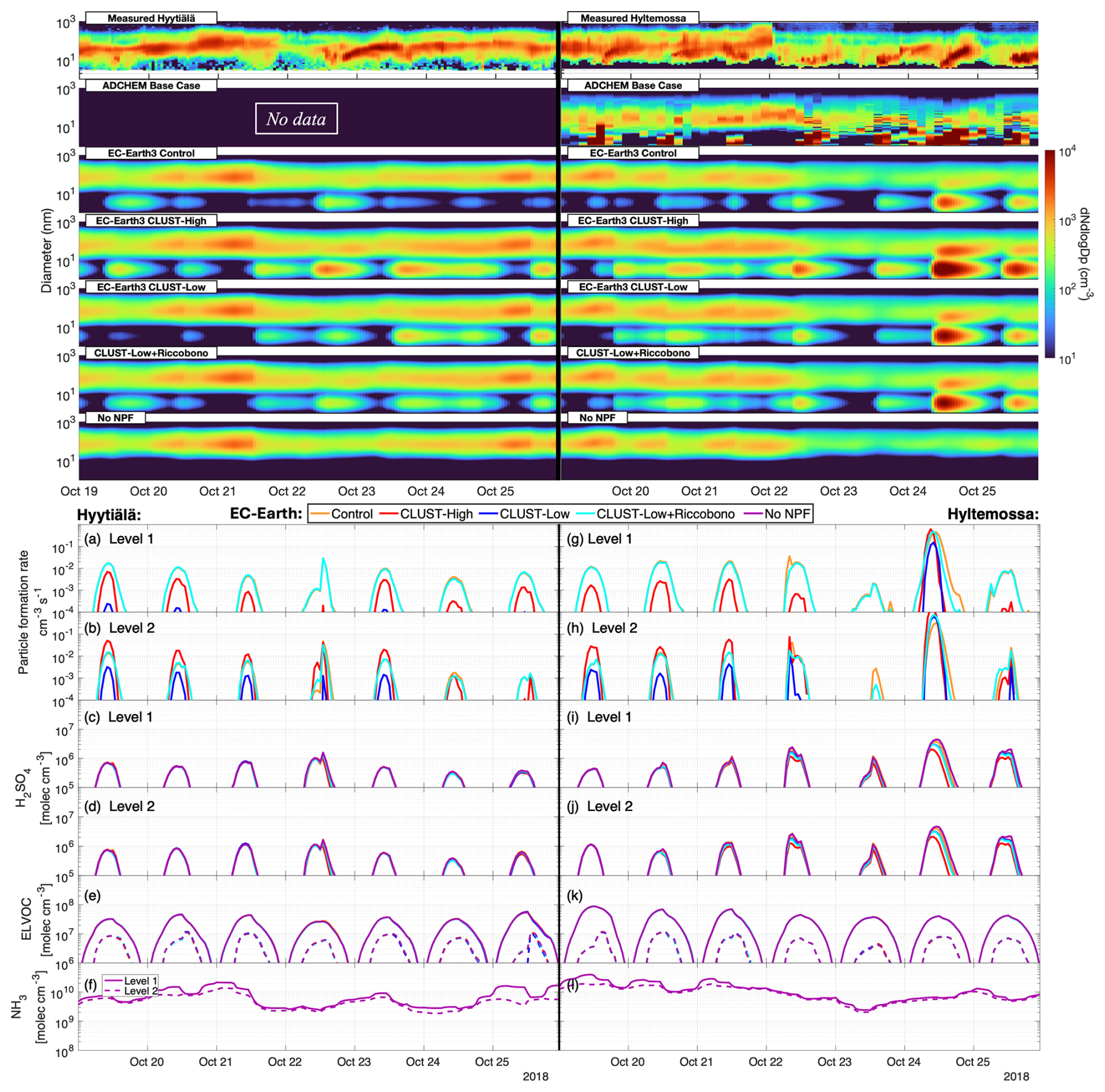 Figure A7The top two figures show the surface aerosol number size distribution over the autumn period for the five modelled EC-Earth3 cases, with the DMPS measured aerosols at Hyytiälä and Hyltemossa. ADCHEM simulations have no available hourly data outside the autumn months for Hyytiälä. The bottom section shows EC-Earth3 modelled layer 1 and layer 2 Hyytiälä and Hyltemossa autumn cases: (a, b, g, h) daily maximum particle formation rate, (c, d, i, j) H2SO4, (e, k) ELVOC, (f, l), NH3 gas concentration. The concentrations for ELVOC and NH3 level 2 are shown as dotted lines in (e, f, k, l). The missing particle formation rates below 10−4 in (a, b, g, h) are considered to be practically zero.