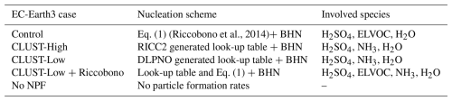 We include five separate “atmosphere-only” simulations for EC-Earth3.4.0-AerChem over the year 2018 with a 3-month spin-up period (i.e. from 1 October to 31 December 2017). Each simulation differs only in terms of the NPF parameterization. The five different simulation setup cases are shown in Table 1, as in Svenhag et al. (2024) but with an additional “no-NPF” case. All EC-Earth3 simulations have nudged meteorology from ERA-Interim for the IFS model (every 6 h) for surface pressure, wind divergence, and vorticity to obtain more homogeneous synoptic weather between cases.