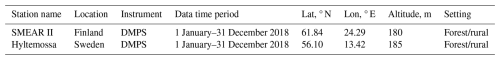 The 2018 measurement data-sets for aerosol particle number size distribution (PNSD) at the two forest stations are produced from differential mobility particle sizer (DMPS) instruments and retrieved from the online EBAS inventory (Tørseth et al., 2012). The instruments measure aerosol diameters down to ≈3 nm, but with increasing uncertainty towards the lowest diameters (Wiedensohler et al., 2012). Uncertainties in observational data-sets obtained with the DMPS can arise from other factors, including calibration and environmental influences, combined with diffusion and electrostatic losses for the smallest diameter aerosols. These uncertainties can affect our interpretation of the PNSD at sub-100 nm. Each ramp (size distribution measurement) takes approximately 10 min with the DMPS. The sampled aerosol numbers are distributed into 52 (Hyytiälä) and 37 (Hyltemossa) size-bins and averaged to 1 h arithmetic means with percentiles. Hyytiälä is the area and nearest small village where the SMEAR II station is located; the coordinates are tabulated in Table 2.