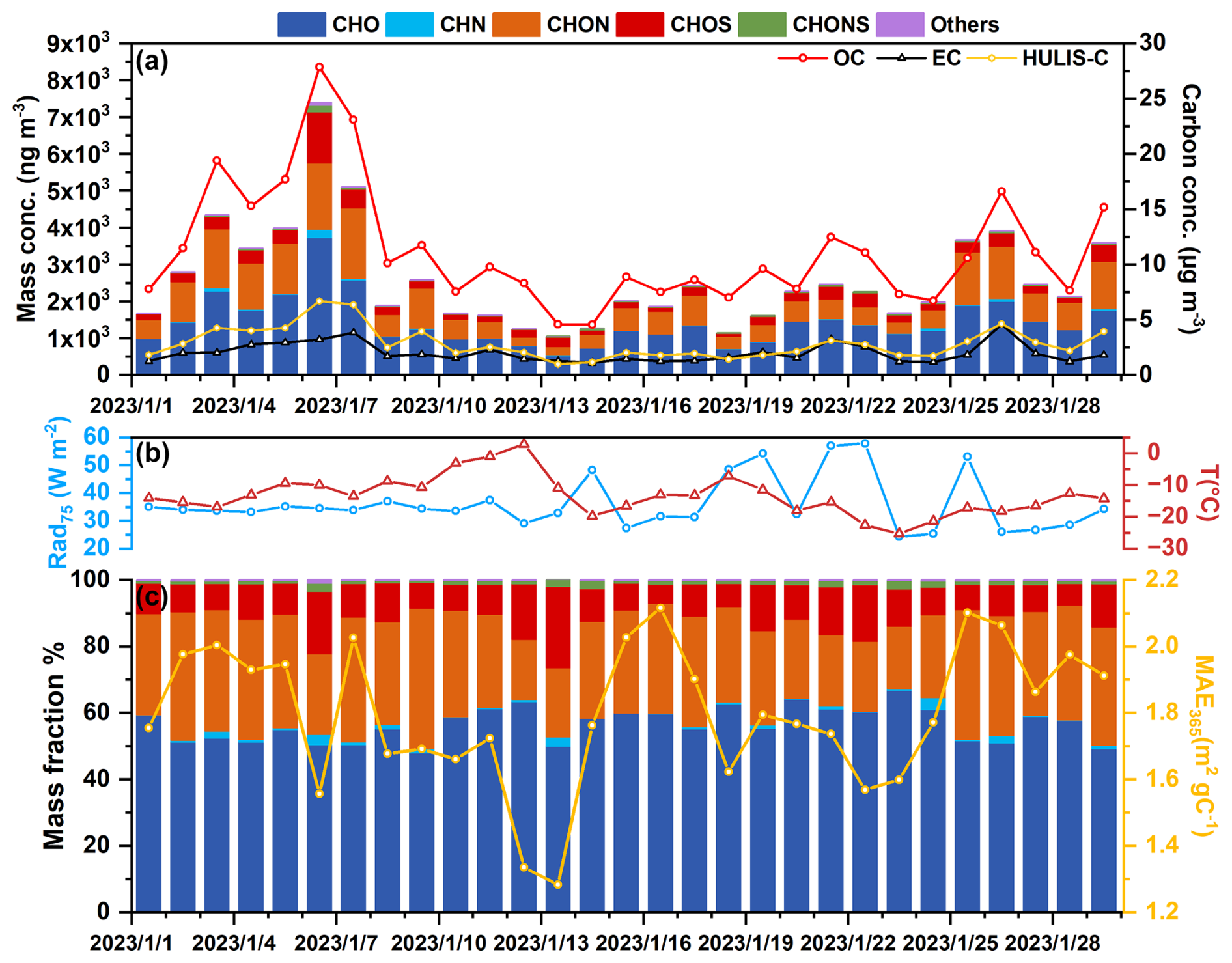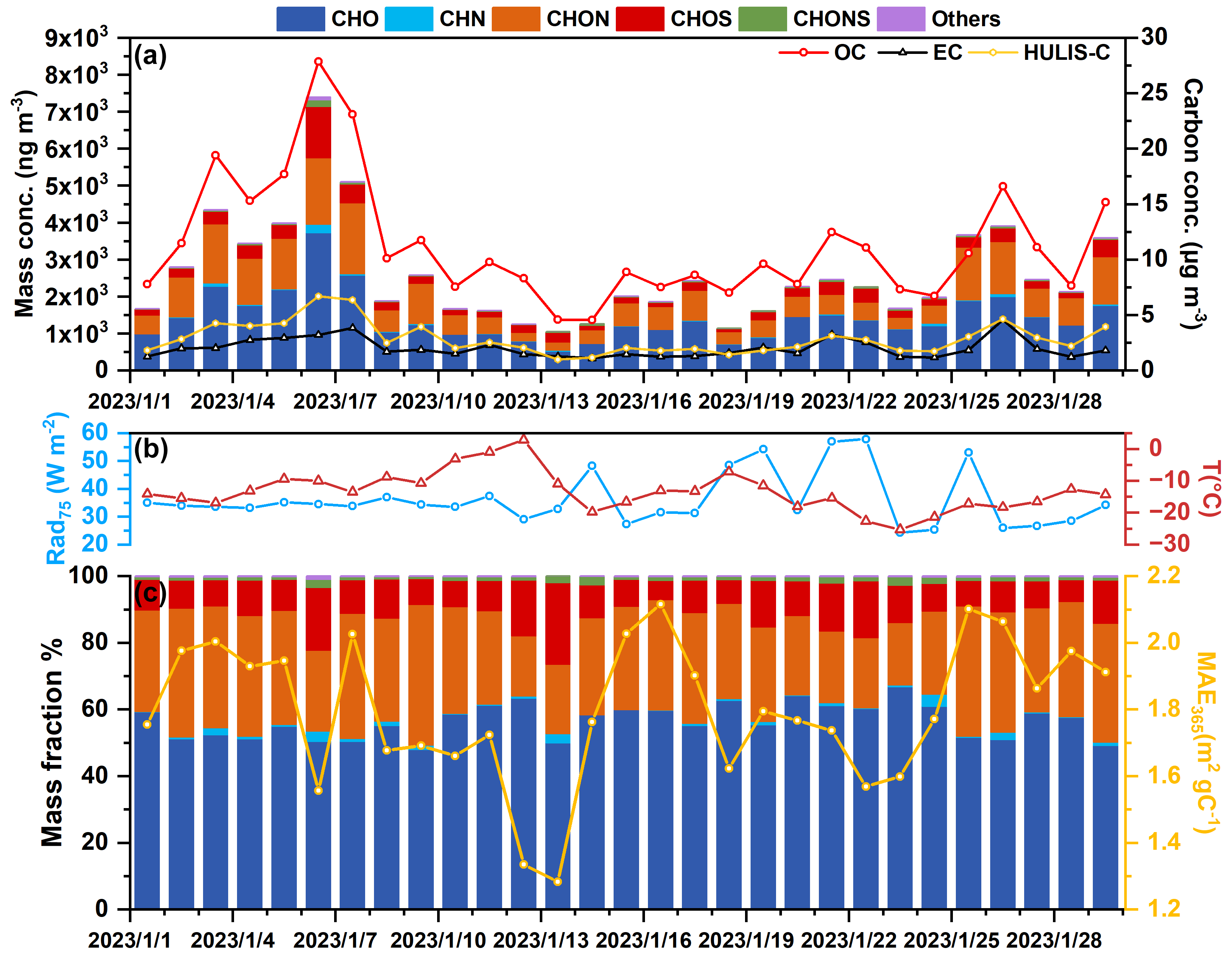 We conducted a field campaign on the campus of Jilin University in Changchun, northeast China (43.83° N, 125.29° E), from 1 to 30 January, 2023. During this period, a high-volume particulate sampler (Tianhong Intelligent Instrument Plant, Wuhan, China, 1.05 m3 min−1) collected 24 h PM2.5 samples on a pre-baked quartz filter. Figure S5 presented the meteorological data (http://www.wunderground.com/, last access: last access: 3 June 2023) and air pollutant data (http://www.cnemc.cn/, last access: 3 June 2023), including relative humidity; temperature; and concentrations of CO, SO2, O3, NO2, PM2.5, and PM10 during the sampling campaign.