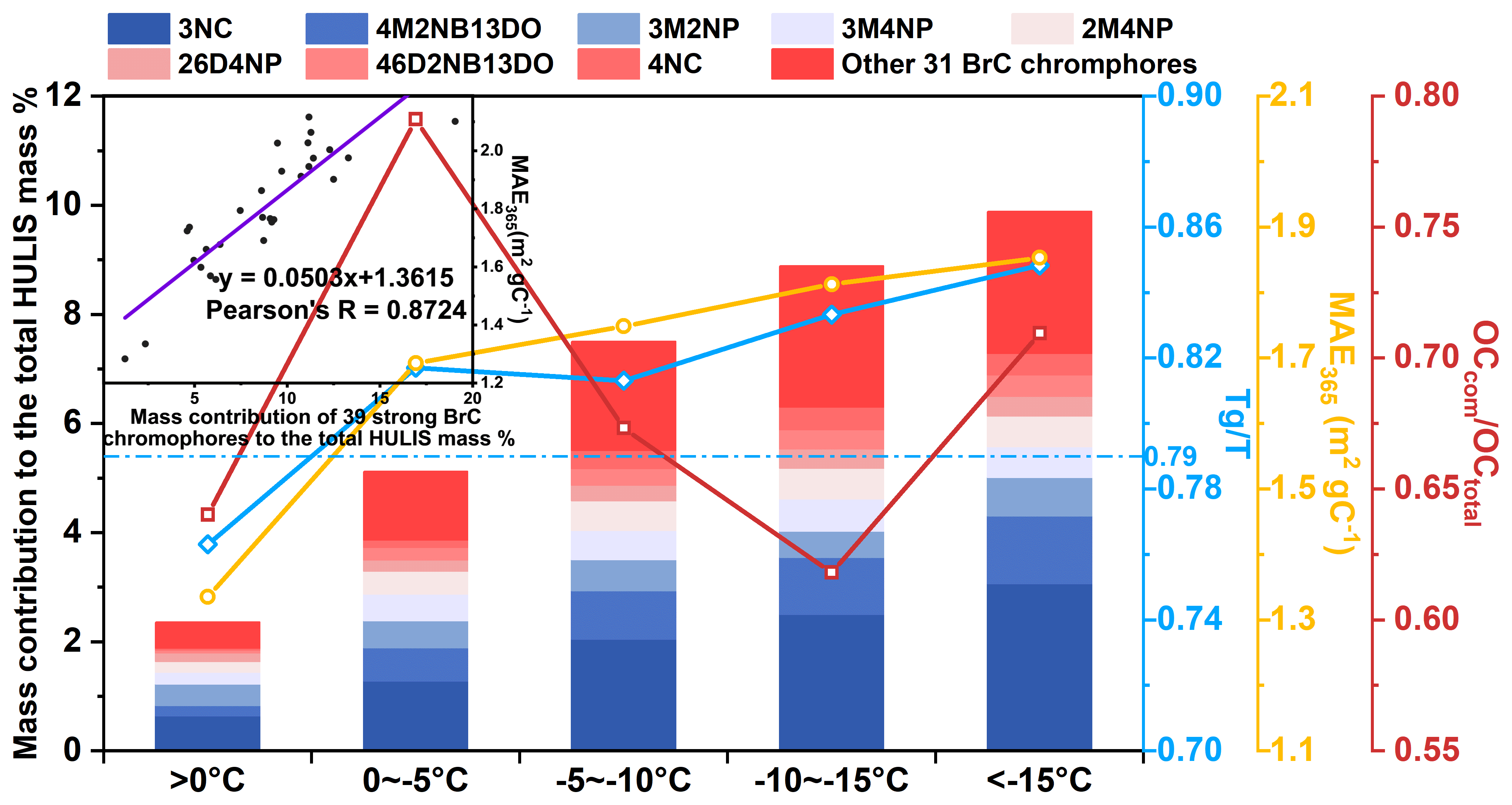 Figure 3Temperature-dependent variations in mass fraction of 39 strong BrC chromophores, MAE365 value of HULIS, ratio, and ratio, with a correlation between chromophore mass fraction and HULIS MAE365. The blue dotted line represented the threshold of between the liquid and semi-solid state (Shiraiwa et al., 2017), and the abbreviations of 3NC, 4M2NB13DO, 3M2NP, 3M4NP, 2M4NP, 26D4NP, 46D2NB13DO, and 4NC represent 3-nitrocatechol, 4-methyl-2-nitrobenzene-1,3-diol, 3-methyl-2-nitrophenol, 3-methyl-4-nitrophenol, 2-methyl-4-nitrophenol, 2,6-dimethyl-4-nitrophenol, 4,6-dimethyl-2-nitrobenzene-1,3-diol, and 4-nitrocatechol, respectively.