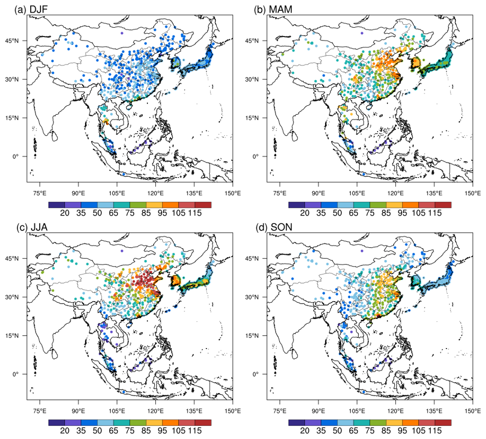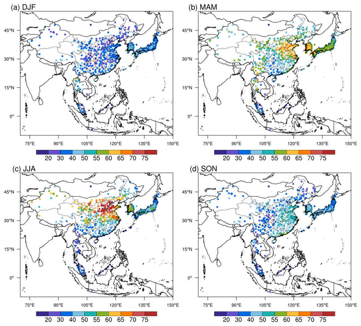 Figure 1The observed seasonal mean MDA8 ozone (nmol mol−1) in (a) DJF, (b) MAM, (c) JJA, and (d) SON averaged over 2017–2021 in East Asia and Southeast Asia. There are eight countries with surface ozone measurements, including Cambodia (one site), China (360 sites), Indonesia (one site), Japan (1187 sites), Malaysia (66 sites), Mongolia (one site), South Korea (473 sites), and Thailand (25 sites).