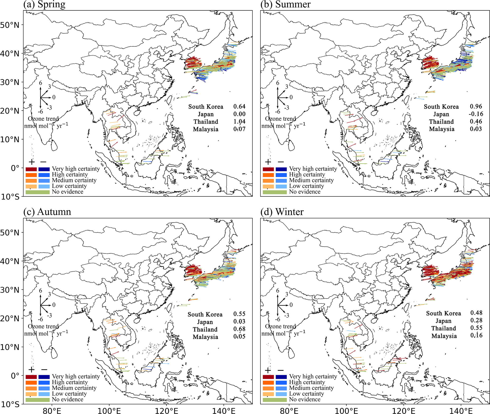 Figure 7The observed 2005–2021 ozone trends (nmol mol−1 yr−1) during (a) spring, (b) summer, (c) autumn, and (d) winter over East Asia and Southeast Asia. Here, it only includes ozone measurements from Malaysia (19 sites), Japan (946 sites), South Korea (226 sites), and Thailand (13 sites). National surface ozone data in China are not available before 2013 and are therefore not shown in this figure. To follow the trend reliability scale recommended by TOAR II, here we use “very high certainty” to denote p≤0.01, “high certainty” to denote 0.05 ≥ p>0.01, and “medium certainty” to denote ; positive trends are in red, and negative trends are in blue.