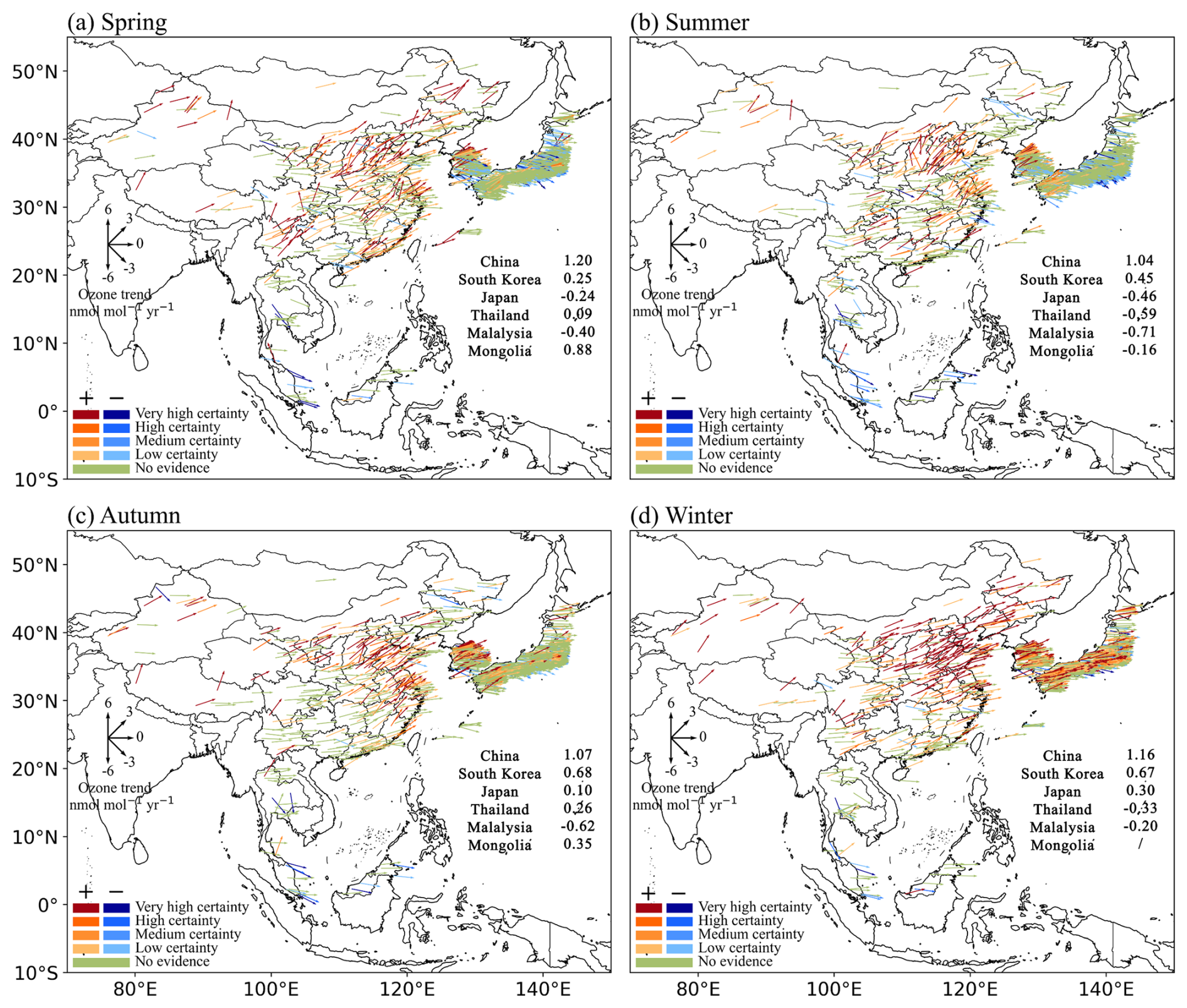 The long-term trend of surface ozone indicates that, based on the available data, high-emission regions in South Korea, Southeast Asia, and China have generally experienced an increase in ozone levels since 2005. However, since 2013, the increase in ozone levels in China has significantly accelerated, while the ozone trends in Thailand and Malaysia in Southeast Asia show no significant changes. Therefore, it is still urgent to elucidate the varying ozone trends in East Asia and Southeast Asia across different seasons over the past decade (Li et al., 2019).