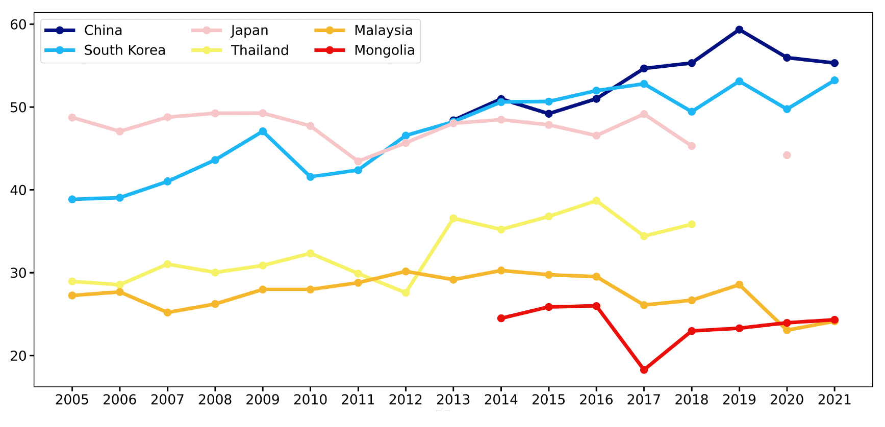 Second, the surface ozone increase in the past two decades is widespread. In particular, South Korea has a national ozone increase with high certainty across different seasons. In Thailand, there is an overall increasing trend in surface ozone but with spatial heterogeneity over 2005–2021. In China, the compiled 11 individual measurements show an overall ozone increase in high-emission regions and at a global baseline station. However, the observed national surface ozone increase in South Korea and Southeast Asia from 2005 is leveling off or has even decreased in the past decade (2013–2021), while the ozone increase in the 2000s over China has amplified since 2013. Surface ozone trends in Japan and Mongolia have been generally flat in the past decade.