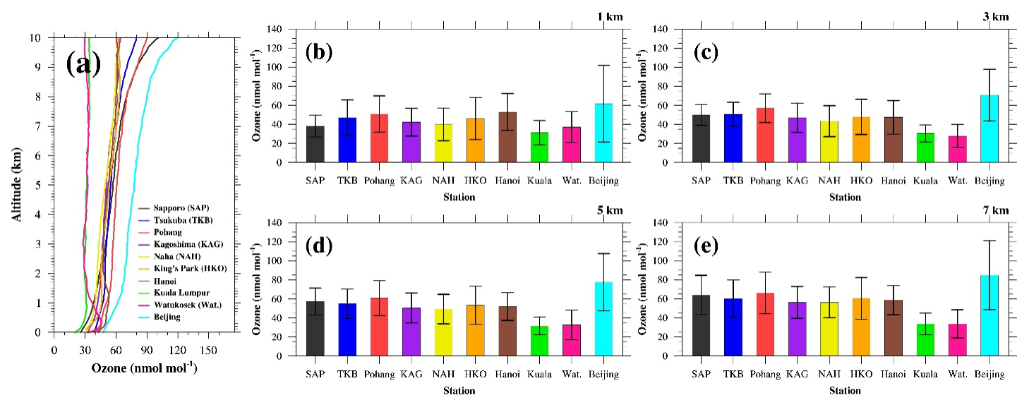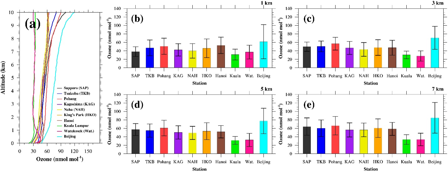Figure 12(a) Climatological mean vertical ozone profiles of 10 ozonesonde sites in the troposphere (from 0 to 10 km altitude) are compared. Also, the mean ozone mixing ratio values of 10 ozonesonde sites at (b) 1 km, (c) 3 km, (d) 5 km, and (e) 7 km altitude are compared. The error bar shows the 1σ standard deviation range.