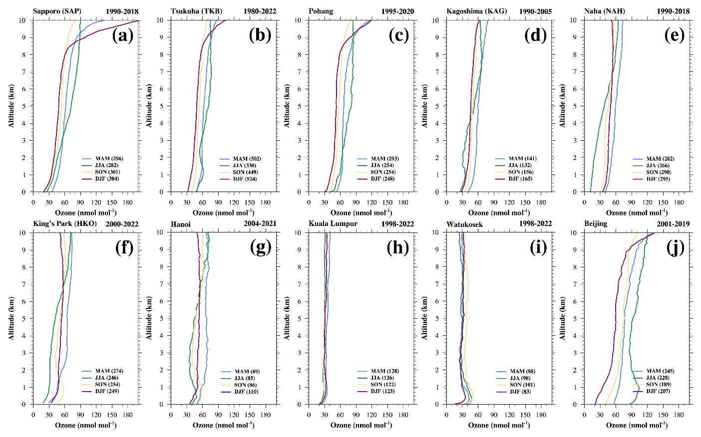 Figure 13Seasonal mean vertical ozone profiles at the (a) Sapporo, (b) Tsukuba, (c) Pohang, (d) Kagoshima, (e) Naha, (f) King's Park, (g) Hanoi, (h) Kuala Lumpur, (i) Watukosek, and (j) Beijing sites: March–April–May (MAM, blue), June–July–August (JJA, green), September–October–November (SON, orange), and December–January–February (DJF, red). The number in the parentheses of each panel indicates the number of data used for each season.