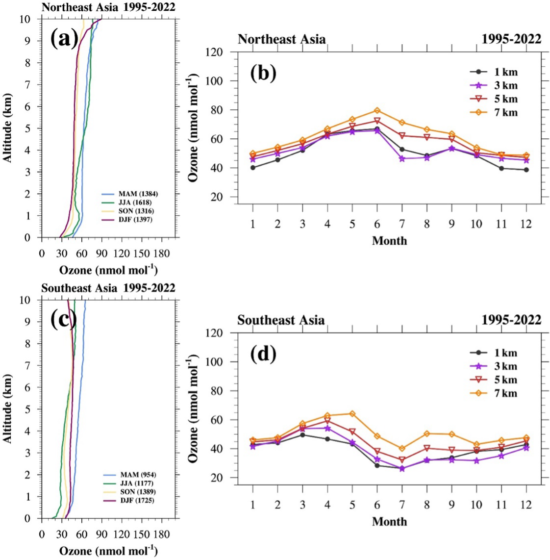 Figure 14Analysis of the IAGOS measurements: (a) seasonal mean vertical ozone profiles in Northeast Asia during March–April–May (MAM, blue), June–July–August (JJA, green), September–October–November (SON, orange), and December–January–February (DJF, red); and (b) monthly mean ozone variation of 1 km (black), 3 km (purple), 5 km (red), and 7 km (orange) altitudes in Northeast Asia. (c) The same seasonal mean vertical ozone profiles but in Southeast Asia and (d) the same monthly mean ozone variation but in Southeast Asia. The number in the parentheses in panels (a) and (c) indicates the number of data used for each season.