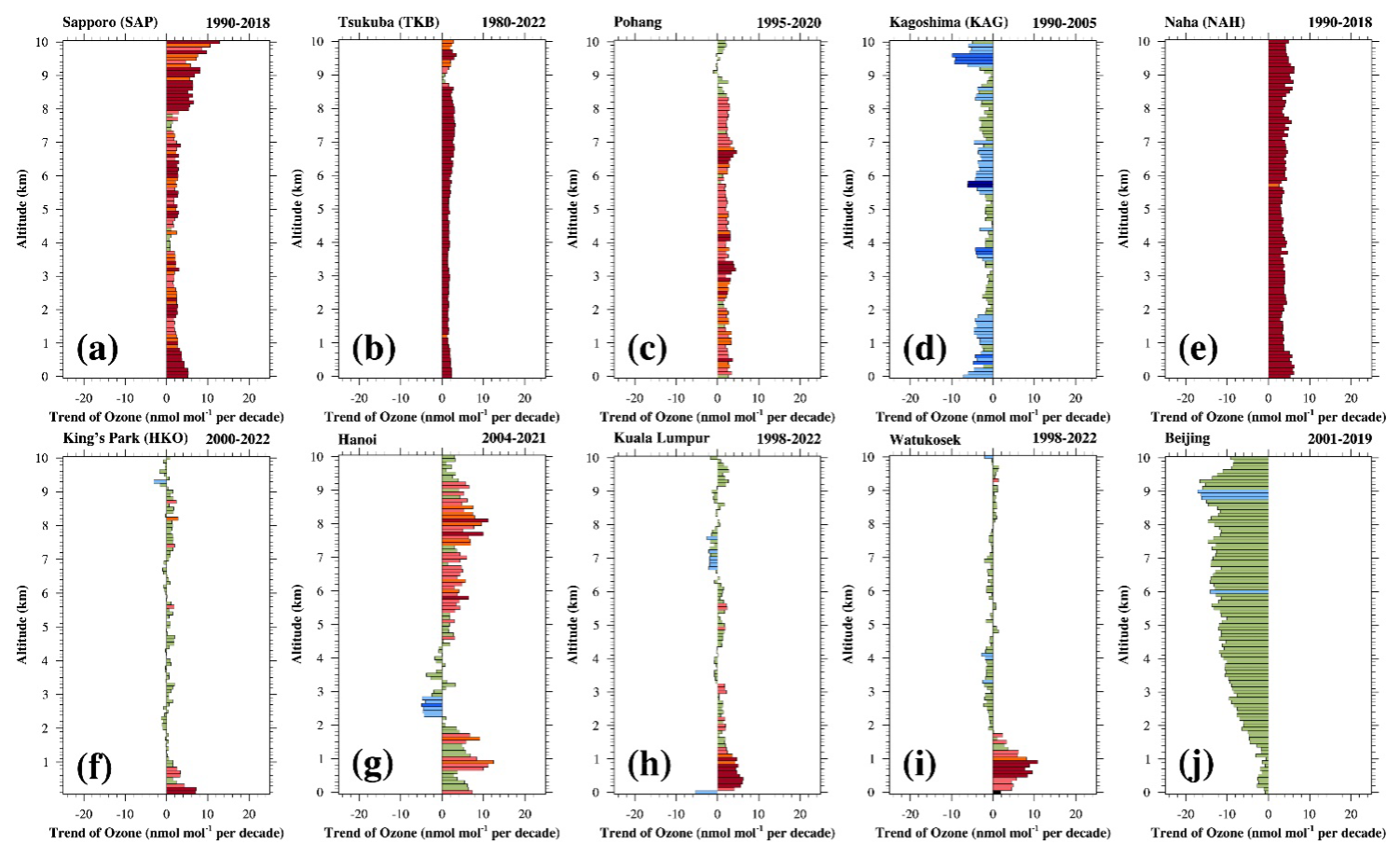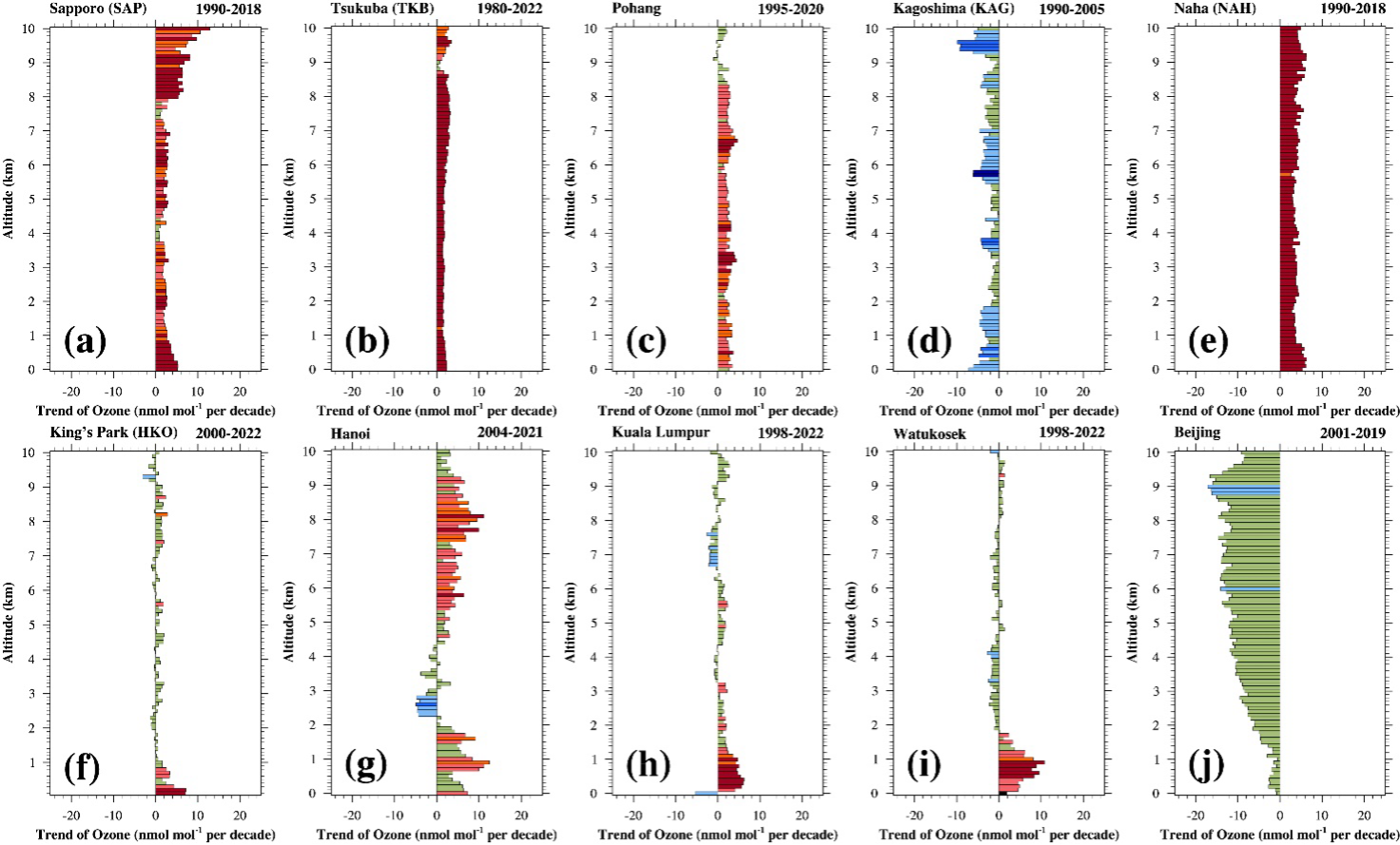 Figure 15Long-term trends of annual median ozone per 100 m range from 0 to 10 km altitude at the (a) Sapporo, (b) Tsukuba, (c) Pohang, (d) Kagoshima, (e) Naha, (f) King's Park, (g) Hanoi, (h) Kuala Lumpur, (i) Watukosek, and (j) Beijing sites. The dark-red color means positive trend values with p≤0.05 (high certainty), the orange color means positive trend values with 0.10 (medium certainty), the light-orange color means positive trend values with (low certainty), the light-olive-green color means positive/negative trend values with p>0.33 (no evidence), the light-blue color means negative trend values with (low certainty), the median-blue color means negative trend values with (medium certainty), and the dark-blue color means negative trend values with p≤0.05 (high certainty).