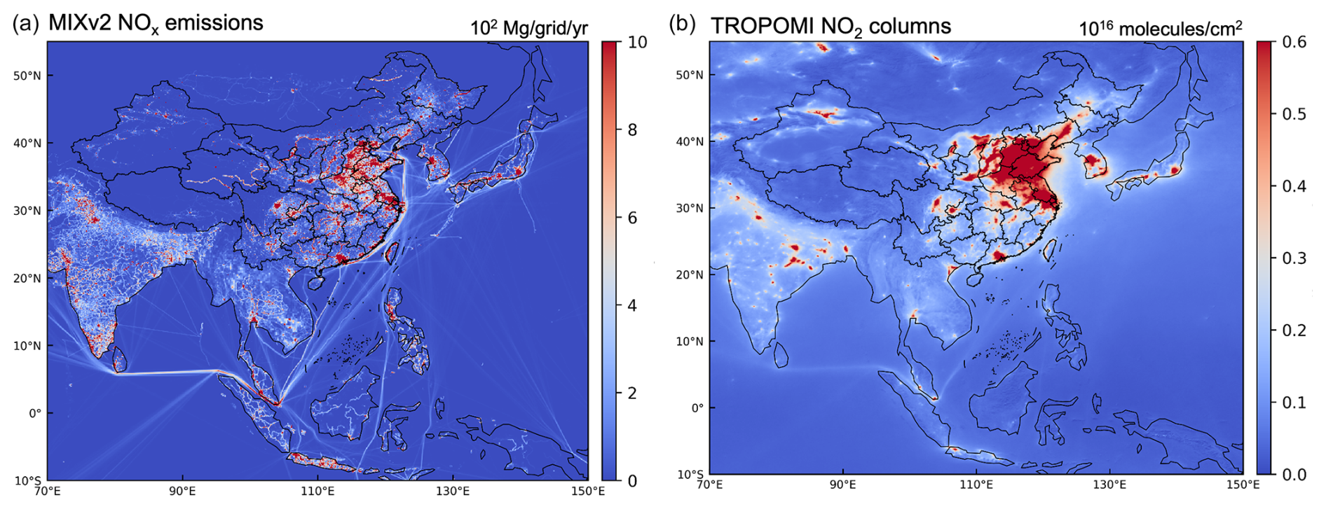 Figure 16The spatial distribution of bottom-up NOx emissions from the MIXv2 inventory (a) and the TROPOMI-satellite-derived NO2 columns (b). Due to data availability, emission data for the year 2017 and satellite data for the year 2019 are used to represent the present-day level (2017–2021).