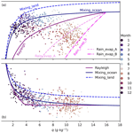 The relationships between δ18O and specific humidity (q) further indicate distinct seasonal patterns in moisture dynamics (Fig. 3a). Owing to the lack of avilability of local meteorological data for 2018, our analyses focused on data collected before 2018. During the non-monsoon season, particularly in the winter months, most data points are positioned above the Rayleigh distillation line but below a mixing line that represents an upper bound of hypothetical evapotranspiration over South Asia. This suggests a mixture of dry end members and moist end members. In contrast, during the summer monsoon season, data predominantly fall below the Rayleigh line, which is influenced by “super-Rayleigh” processes linked to rain evaporation.