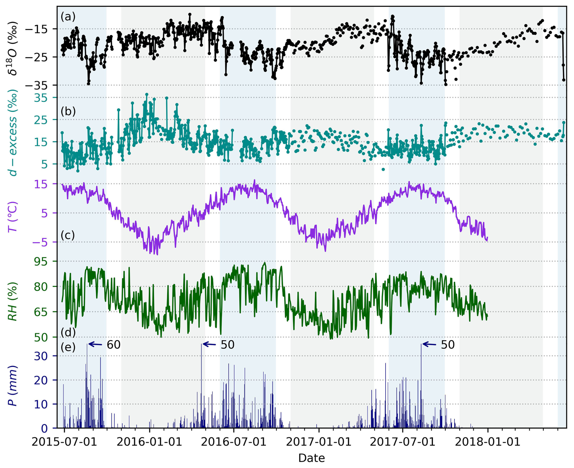 Figure 1Time series of observed vapor δ18O, d-excess, and daily local meteorological variables from 2015–2018: (a) δ18O, (b) d-excess, (c) air temperature, (d) relative humidity (RH), and (e) precipitation amount. The light blue shading highlights the summer monsoon season, whereas the light steel blue shading indicates the non-monsoon season.