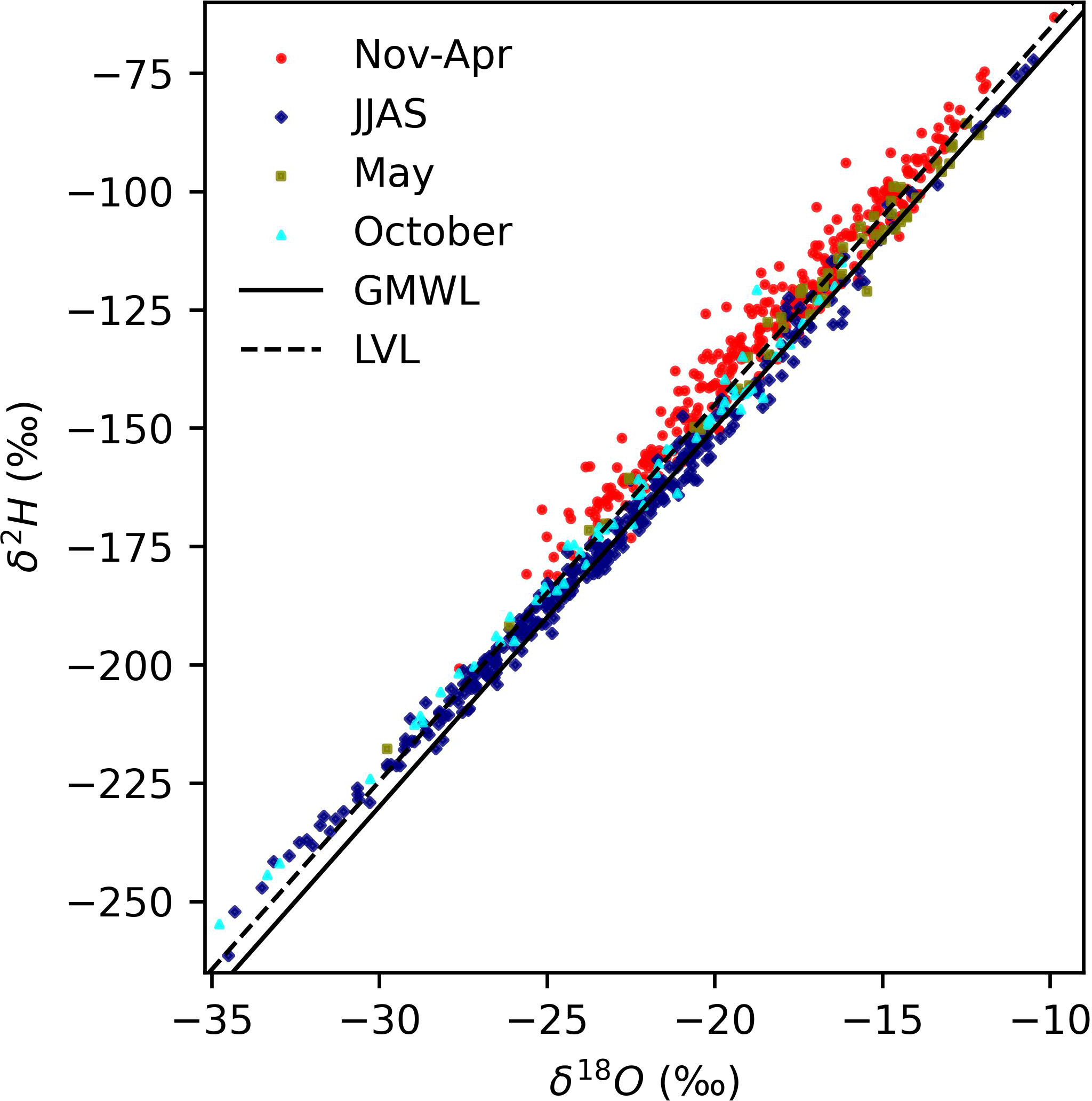 Figure 2Relationship between vapor δ2H and δ18O. The data are presented for different seasons: non-monsoon (November–April) as red dots, summer monsoon (JJAS) as navy diamonds, May as olive squares, and October as cyan triangles. The solid line indicates the global meteoric water line (GMWL). The dashed line indicates the local vapor line (LVL) estimated from all the δ2H and δ18O data points.