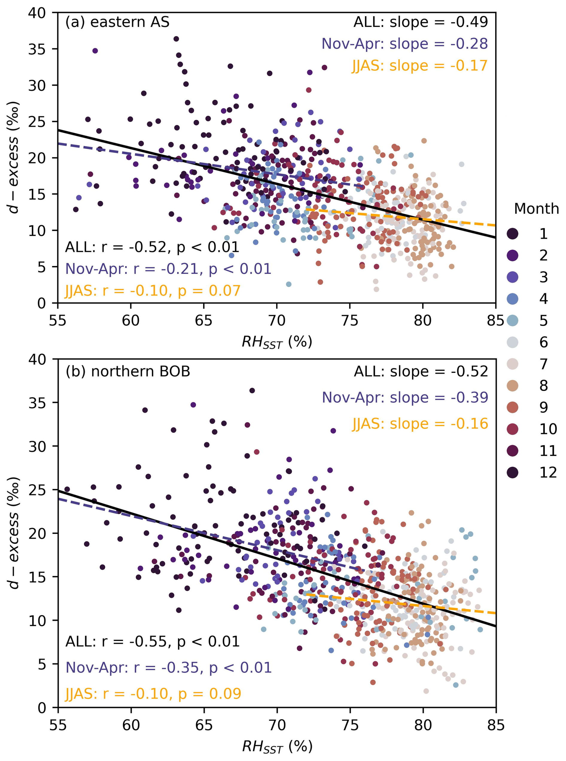 Figure 6Relationships between SETP vapor d-excess and relative humidity normalized to sea surface temperature (RHSST) averaged over (a) the eastern Arabian Sea (7–20° N and 65–78° E) and (b) the Bay of Bengal (10–22° N and 80–99° E) from 2015–2017. Each data point is color-coded by month. The solid black lines indicate the linear regression between all the data points. The dashed orange lines indicate linear regression for data during the non-monsoon season (November–April), and the dashed dark blue lines indicate data during the summer monsoon (JJAS). The slopes (‰ %−1), r values, and p values for the three data groups are also shown.