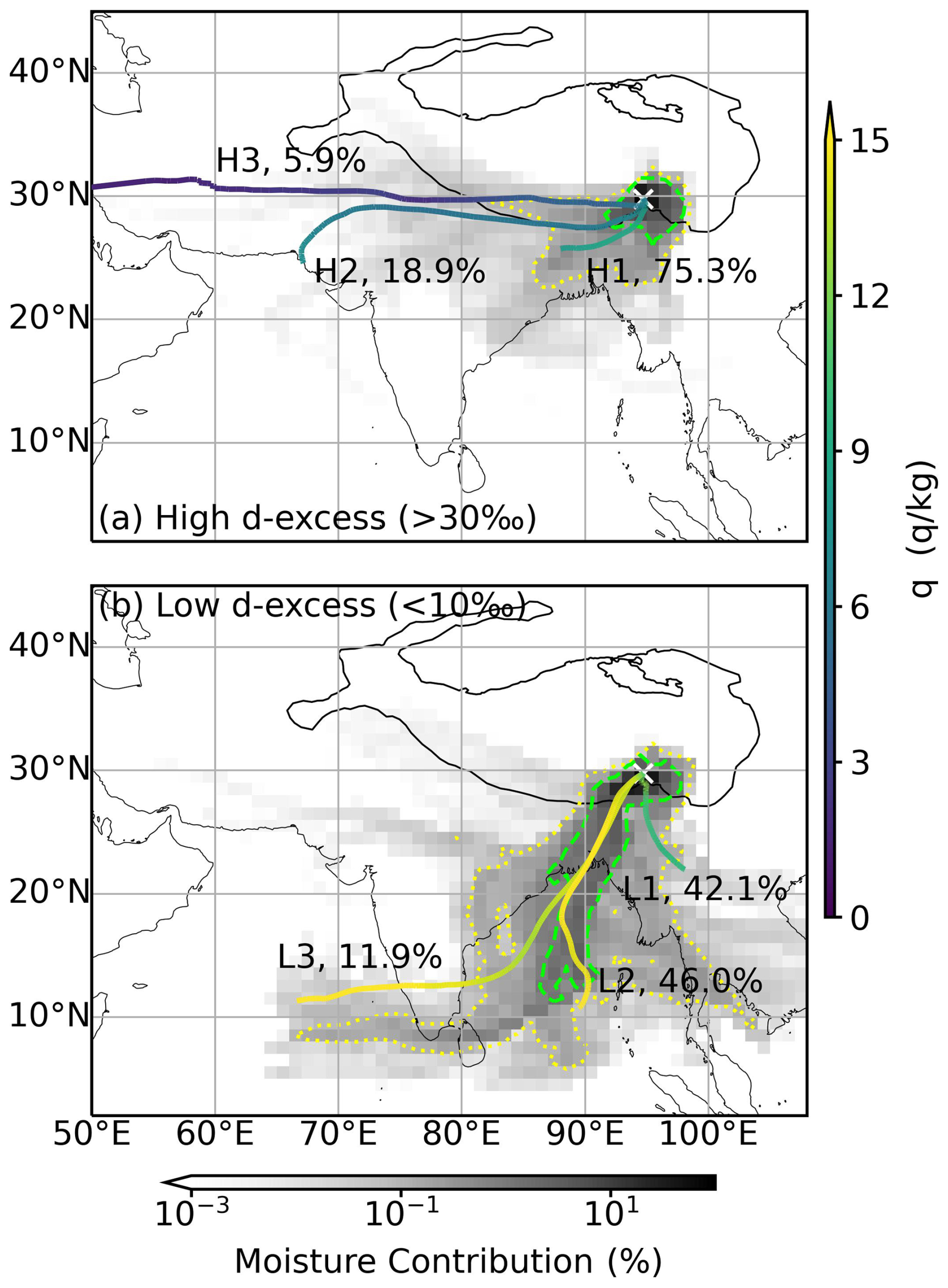 We performed a composite analysis of moisture sources and transport pathways for the highest (higher than 30 ‰, and n=10) and lowest (lower than 10 ‰, and n=8) d-excess observations during the non-monsoon season (Fig. 7). High d-excess values are associated primarily with moisture transported by westerlies from regions west or southwest of the SETP, such as over the TP and northern India. In addition, backward trajectories for these cases show air masses characterized by extremely low q values, reaching below 2 g kg−1 along the mean trajectories (weighted by moisture contribution) across the TP (Fig. 7a). Conversely, for low d-excess cases, the moisture transport pathways shift toward more humid regions south of the SETP, including northeast India, Bangladesh, and the BOB (Fig. 7b). This contrasting moisture transport pattern between high and low d-excess cases aligns with our hypothesis that high d-excess values are associated with dry and cold air transported by westerlies.