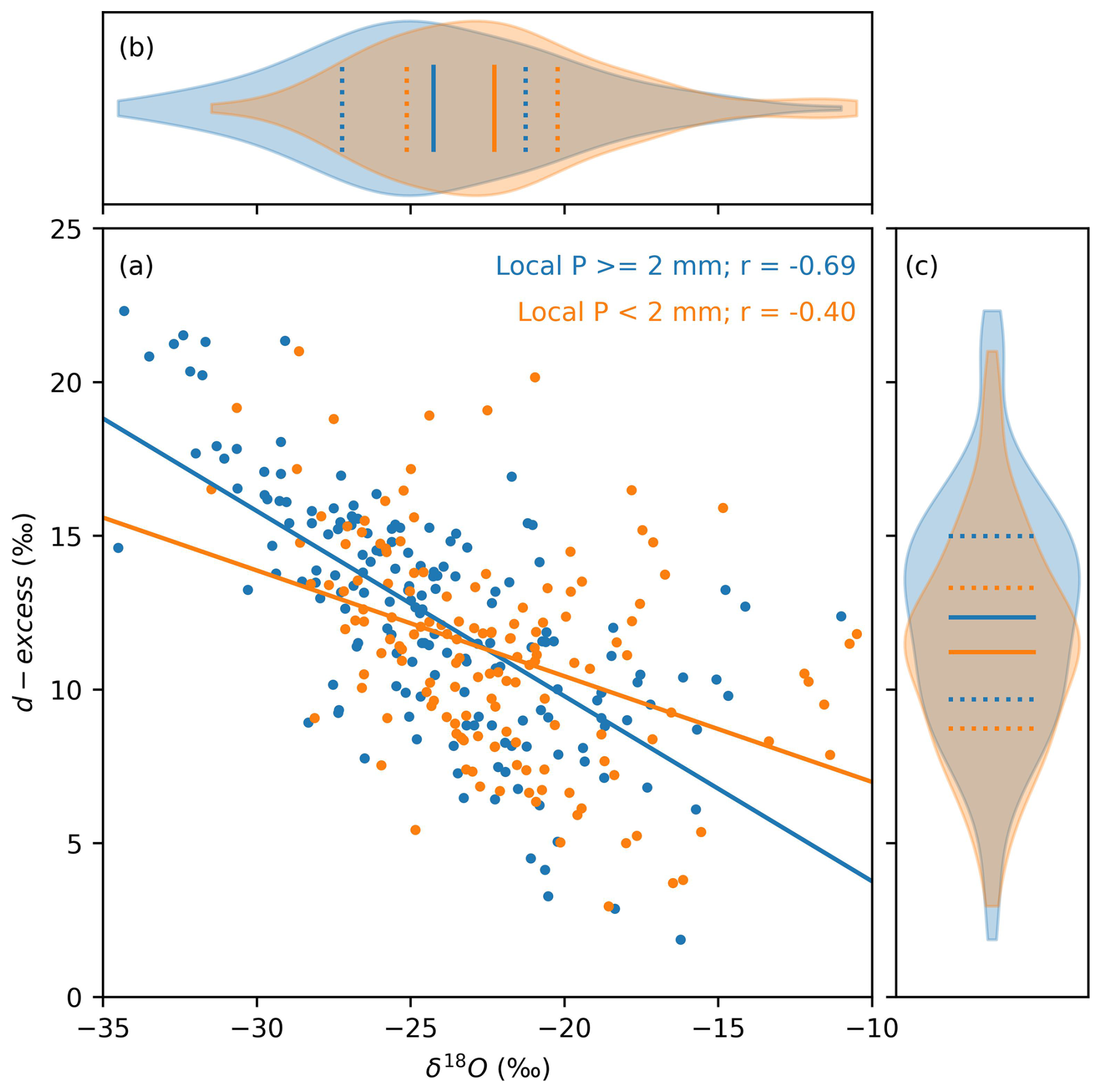 Figure 9Relationships between SETP vapor d-excess and δ18O during the summer monsoon season. (a) Scatter plot of d-excess against δ18O and linear regression lines between them. (b) Distribution of δ18O values, with the dashed lines indicating values at the lower and upper quartiles and the solid lines indicating the mean values. (c) Same as (b) but for d-excess. Orange colors indicate data observed when the daily precipitation amount is less than 2 mm, and blue colors indicate data observed during days when the precipitation amount is not less than 2 mm. The r values for both lines are indicated in (a), and both are significant at the 0.01 level.