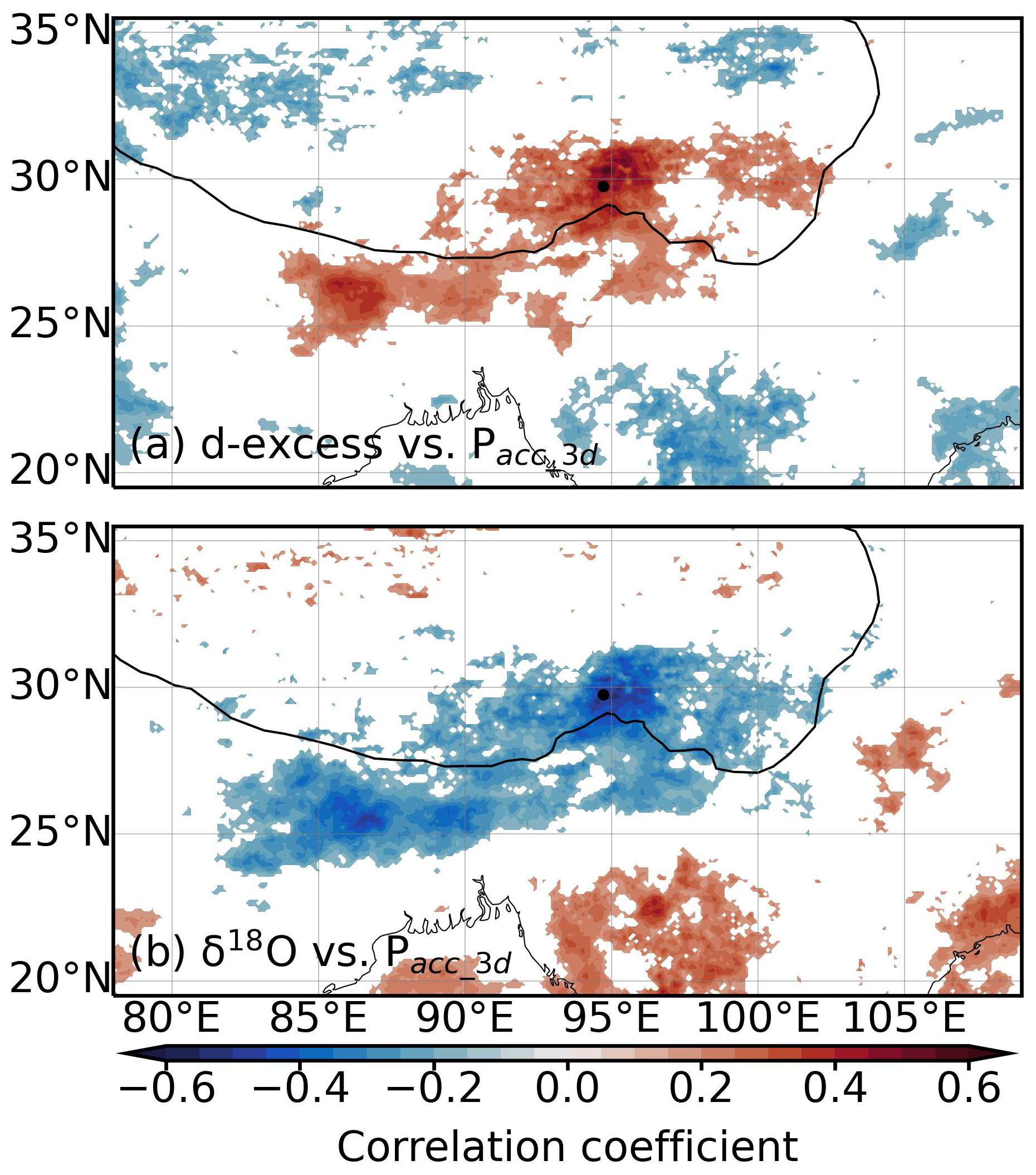 Figure 10Relationships between vapor isotopes for rainy days (local daily precipitation amount not less than 2 mm) and total precipitation amount at the regional scale during the summer monsoon season. (a) Spatial distribution of correlation coefficients between d-excess and total precipitation amount during the 3 d prior to sampling (Pacc_3d). (b) Same as (a) but for δ18O. Only values significant at the 95 % significance level are shown. The black dots indicate the location of the SETP station. The black solid lines denote the Tibetan Plateau with an altitude contour at 3000 m.