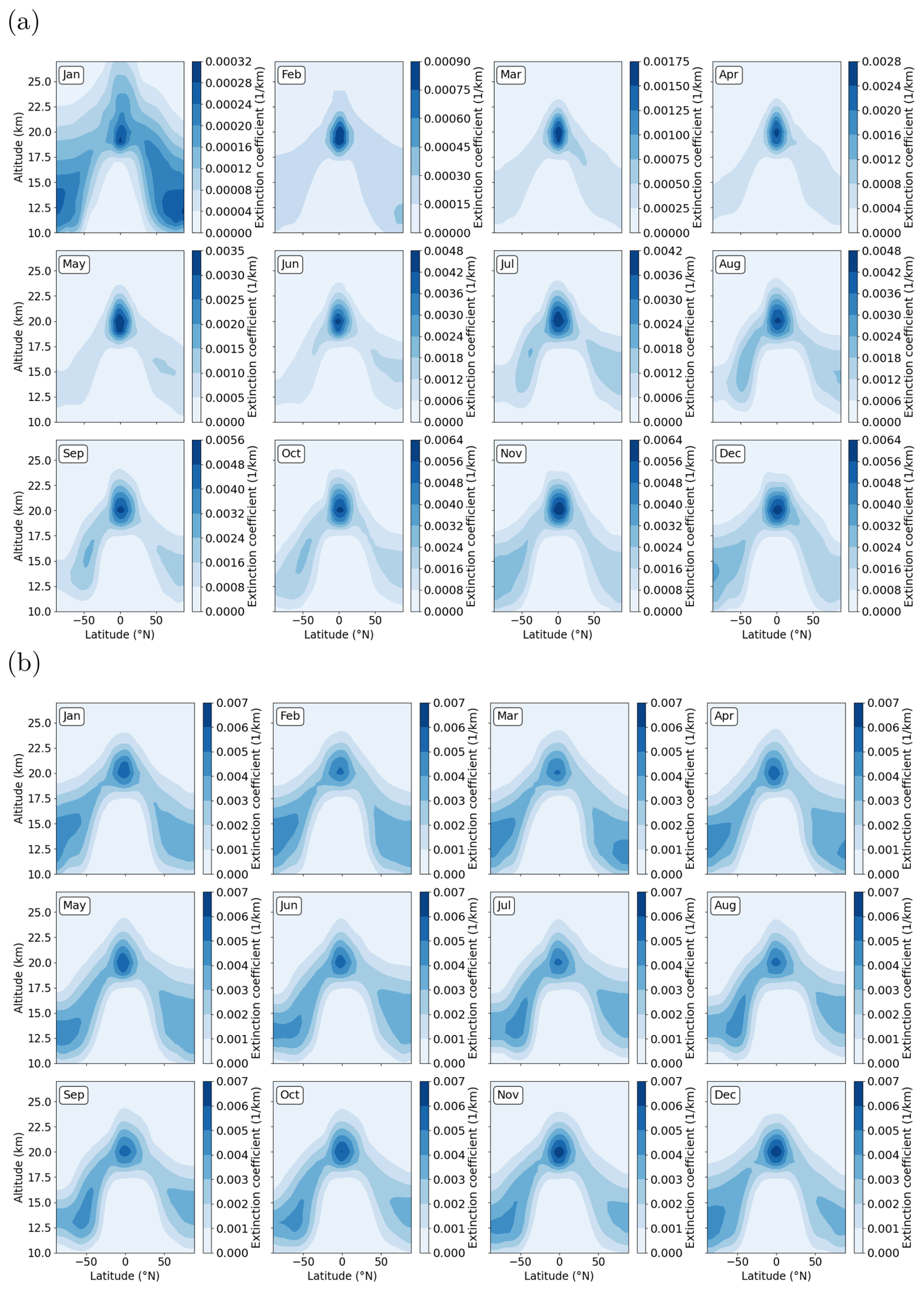 Figure 1 shows the extinction coefficients at 550 nm for January (Jan) to December (Dec) based on the ECHAM model simulations for the injection of 1 Tg S yr−1 for the quasi-steady-state phase and the initial phase, demonstrating the differences between these two phases. The upper panel (a) of Fig. 1 displays ECHAM simulation results of the first year of the initial phase, and the lower panel (b) displays results of the quasi-steady-state phase. As previously described, the initial phase data include the first 2 years, and the quasi-steady-state phase data include an average over 3 years (years 12 to 15).