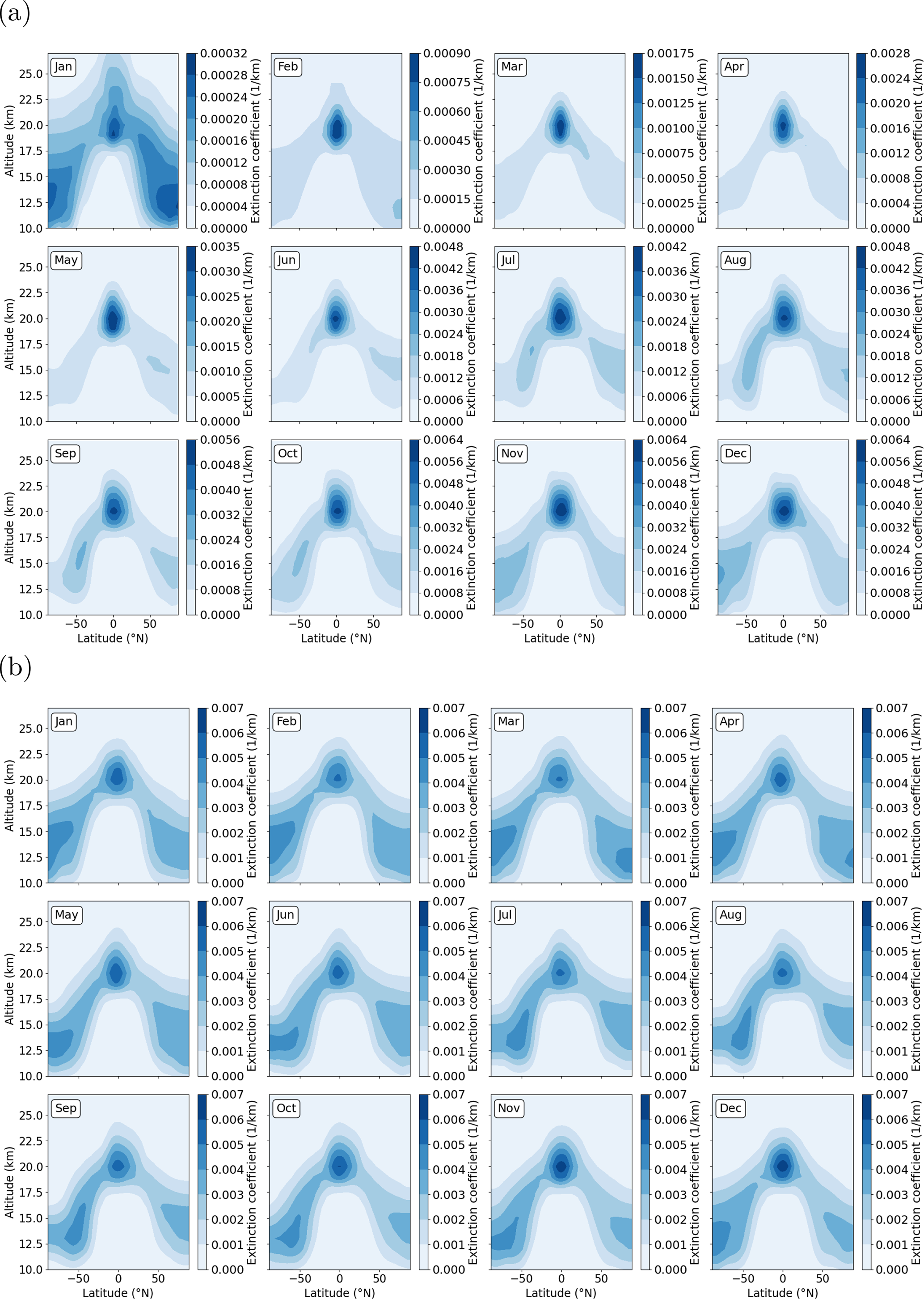 The model output of the 95 levels was interpolated to provide aerosol extinction coefficients at 500 and 550 nm between 10–27 km, in 1 km steps. The provided aerosol extinction coefficient profiles are monthly averages.