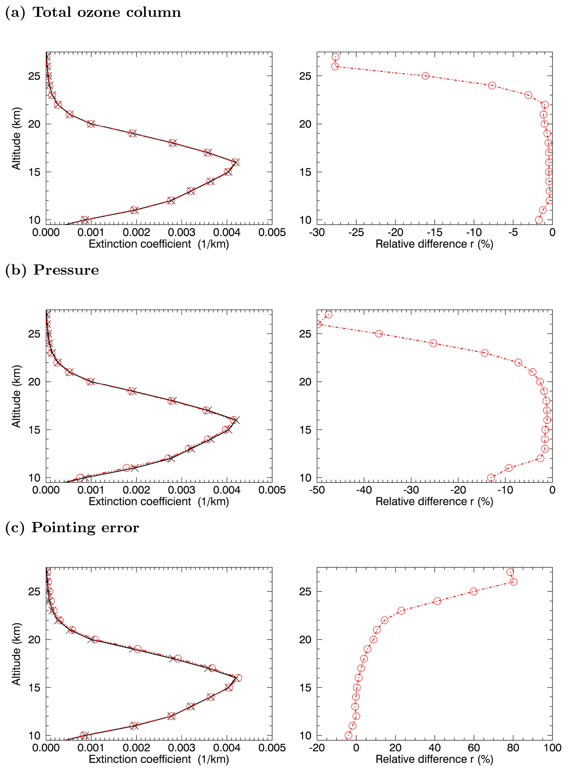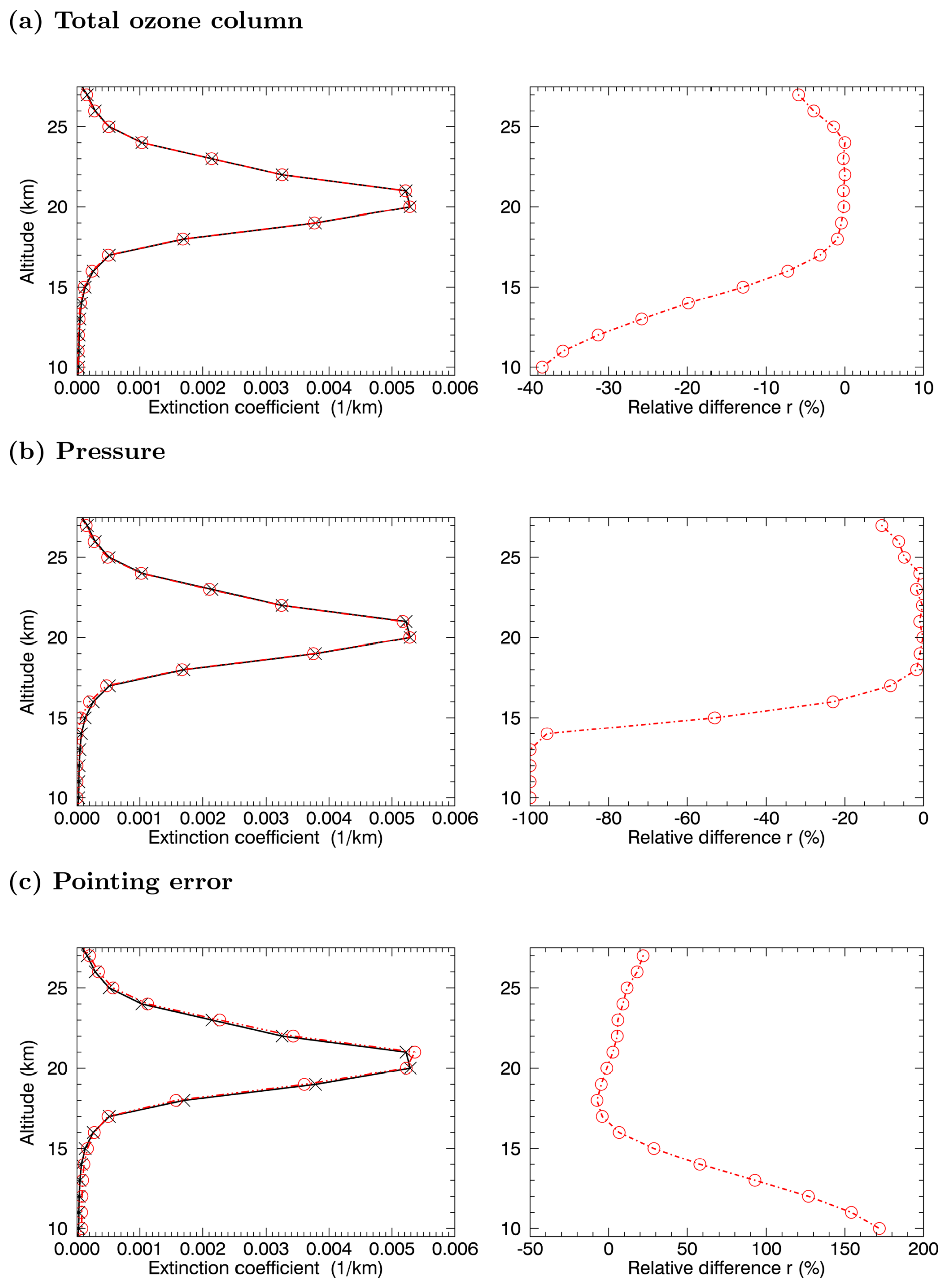 (e.g. Garane et al., 2019)(e.g. Nowlan et al., 2007; Langland et al., 2008)(e.g. Nowlan et al., 2007; Langland et al., 2008)(e.g. Bramstedt et al., 2012)Figure 2 shows the retrieved aerosol extinction profiles at 520 nm with reference settings (black line) and modified settings (red line) exemplarily for 1 Tg S yr−1, 5° N and January based on the ECHAM model simulation results of the quasi-steady-state phase (left column) and the resulting relative difference (individual errors) (right column). The following parameters are exemplarily shown: (a) total ozone column, (b) pressure, and (c) pointing error. More figures for different latitudes can be found in Appendix A (Figs. A2, A3).