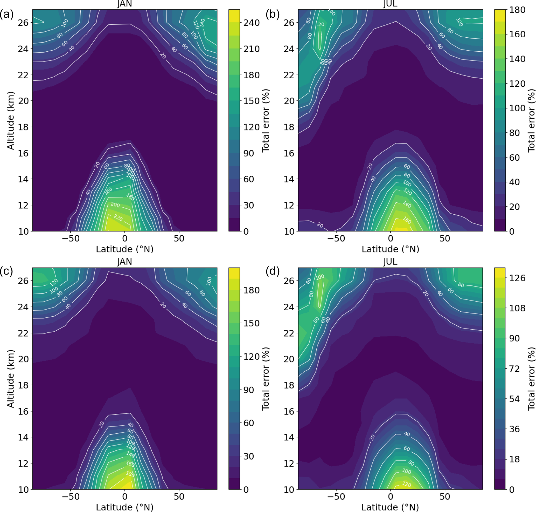 As mentioned above, the total errors from the background case are used for the error analysis of the retrieval of the first month of the initial phase. Figure 7 shows the total errors in percent for the background case, i.e. 0 Tg S yr−1, in January. The aim is to see whether it is possible to observe the emission of 1 Tg S yr−1 in the first month of the initial phase subplot (Jan) of panel (a) in Fig. 1. Comparing the total errors with those for 1 and 2 Tg S yr−1 in the quasi-steady-state phase (see Sect. 3.2), the total errors in the background case are clearly larger. Also in this case, the total errors vary with altitude and latitude (see Fig. 7).