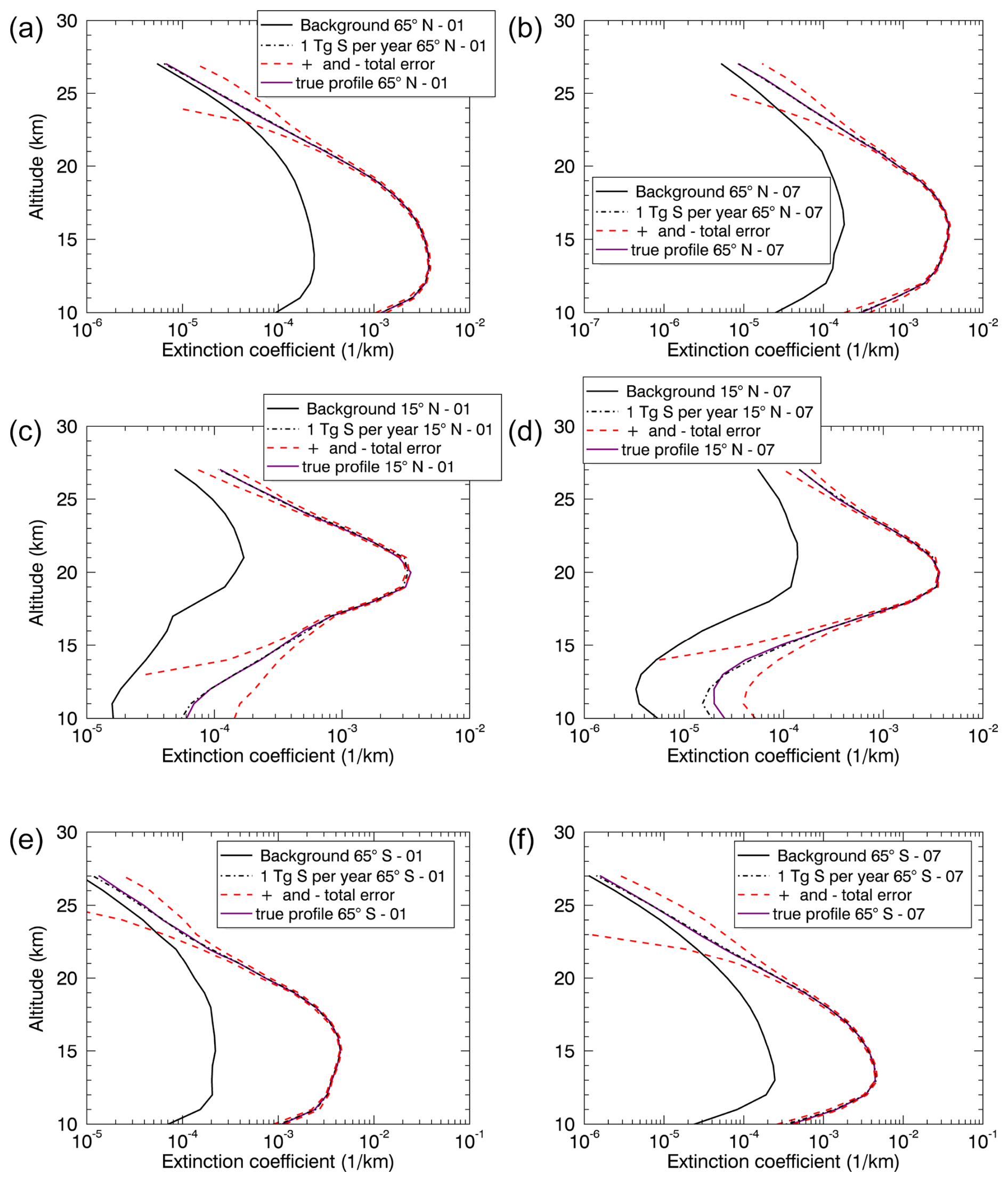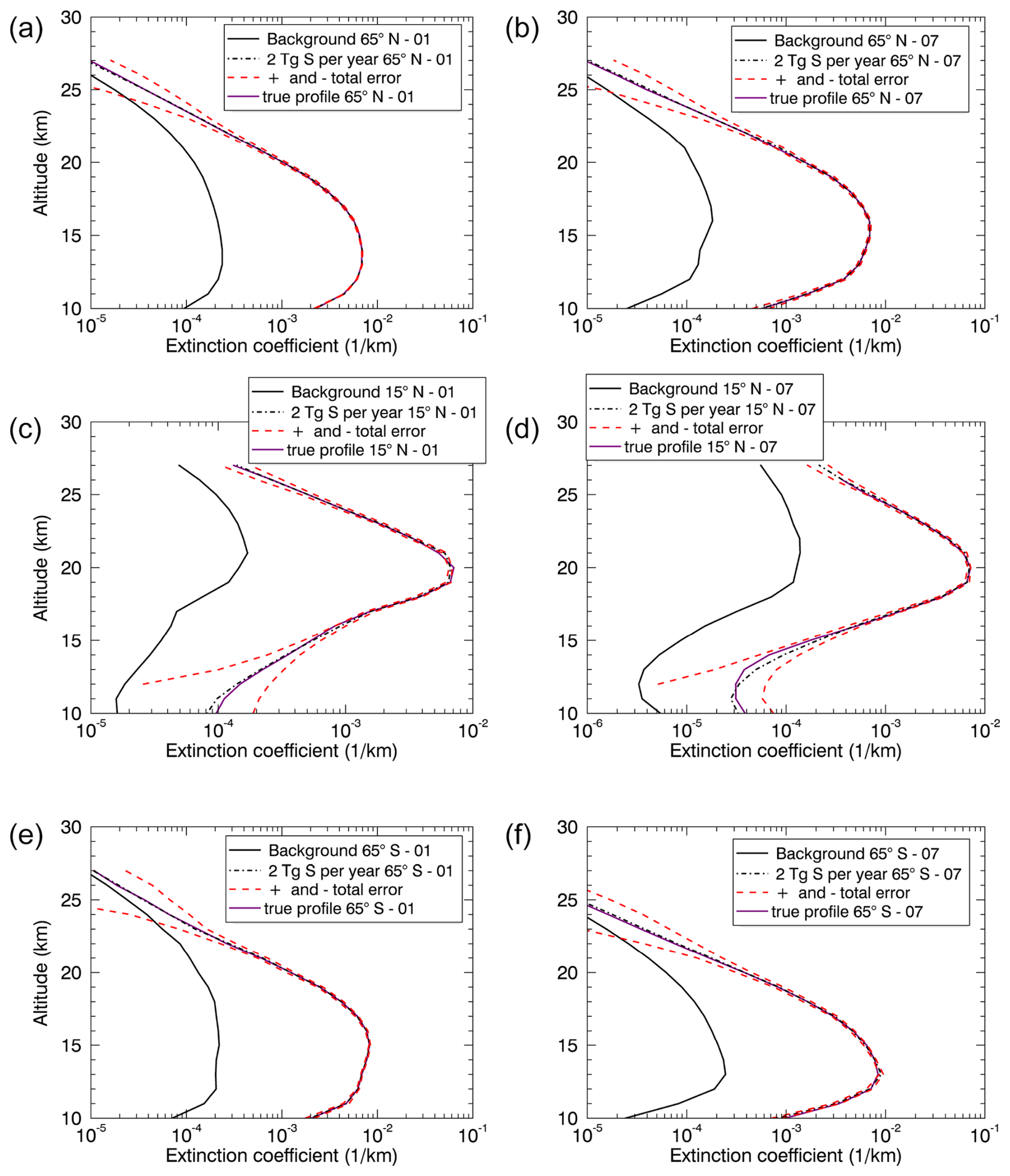 Figures 4 and 5 show the retrieved aerosol extinction profiles at 520 nm (black dashed lines) for 1 Tg S yr−1 (Fig. 4) and 2 Tg S yr−1 (Fig. 5), both for January (left column) and July (right column), including the corresponding total errors (red dashed lines), the background profiles (black solid lines), and true profiles (purple solid lines), both at 520 nm (ECHAM model simulation results) for 65° N (upper panels), 15° N (middle panels), and 65° S (lower panels).
