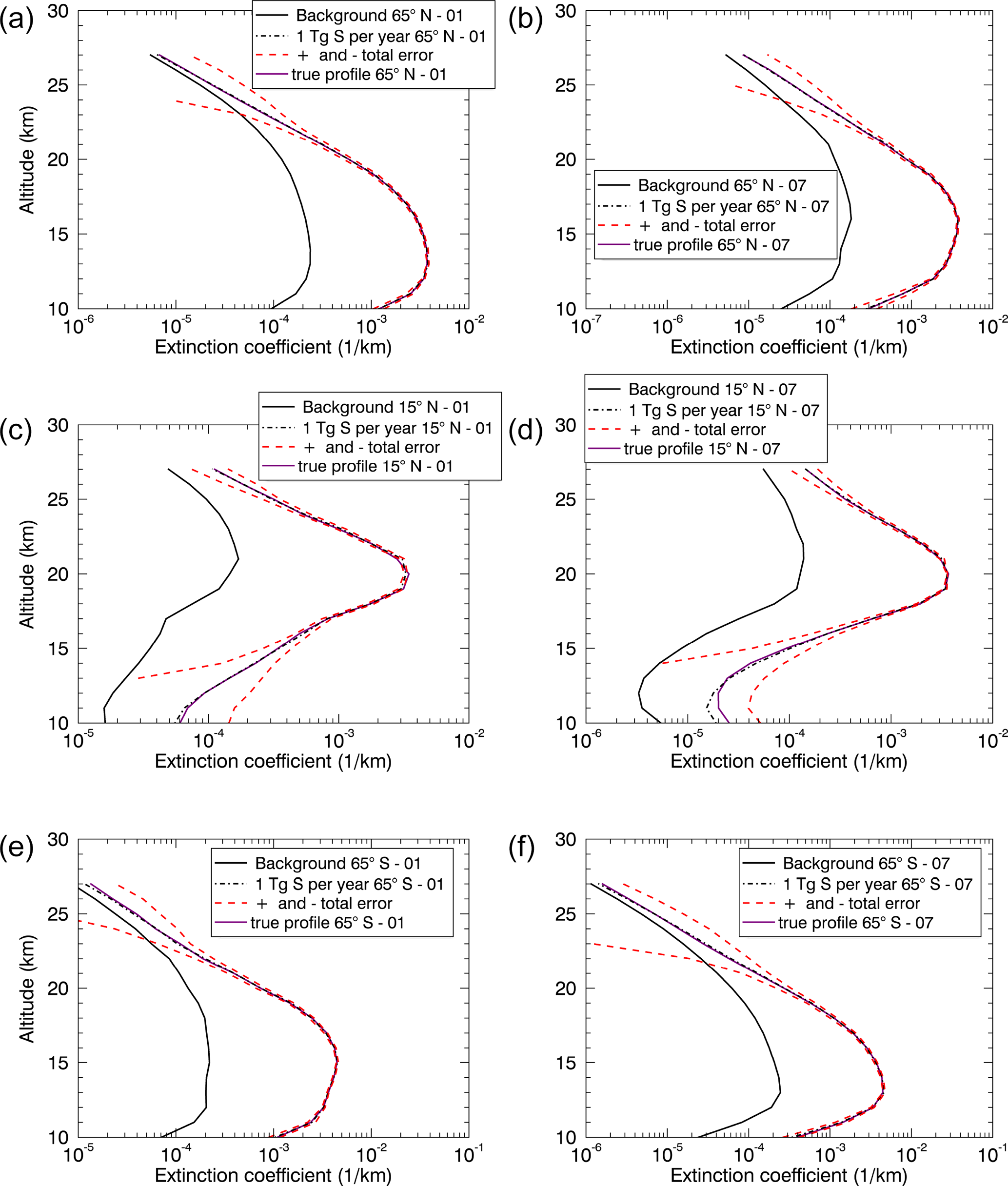 Figure 4Retrieved aerosol extinction profiles at 520 nm for 1 Tg S yr−1 in January (a, c, e) and July (b, d, f) of the quasi-steady-state phase including total errors, background profiles (520 nm), and true profiles (520 nm) (ECHAM simulation results). Latitudes: 65° N (a, b), 15° N (c, d), and 65° S (e, f).