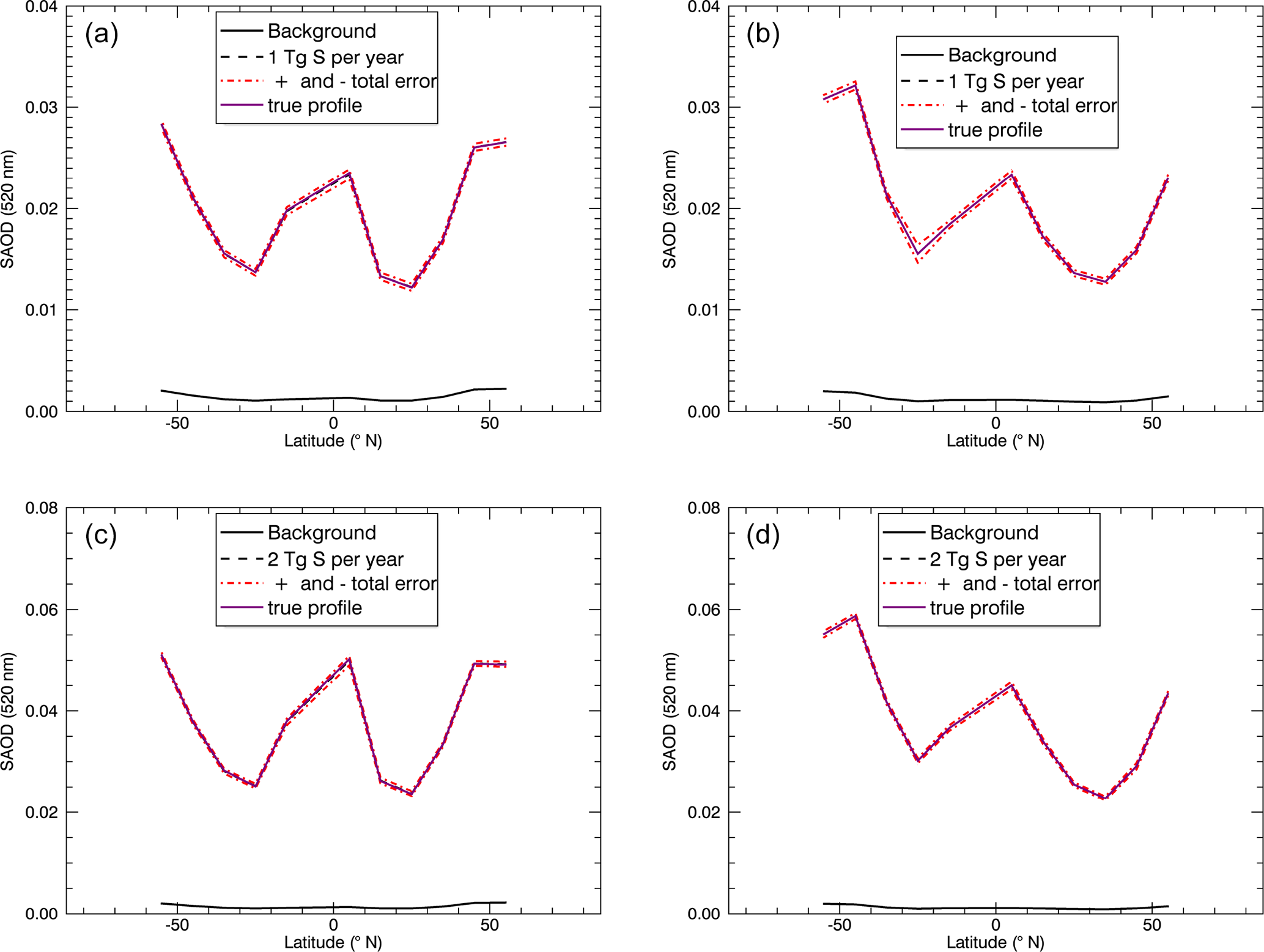 Figure 6SAOD (520 nm) over latitude (° N) for 1 Tg S yr−1 (a, b) and 2 Tg S yr−1 (c, d), and for January (a, c) and July (b, d), including the corresponding total errors, background cases, and true profiles (ECHAM simulation results).