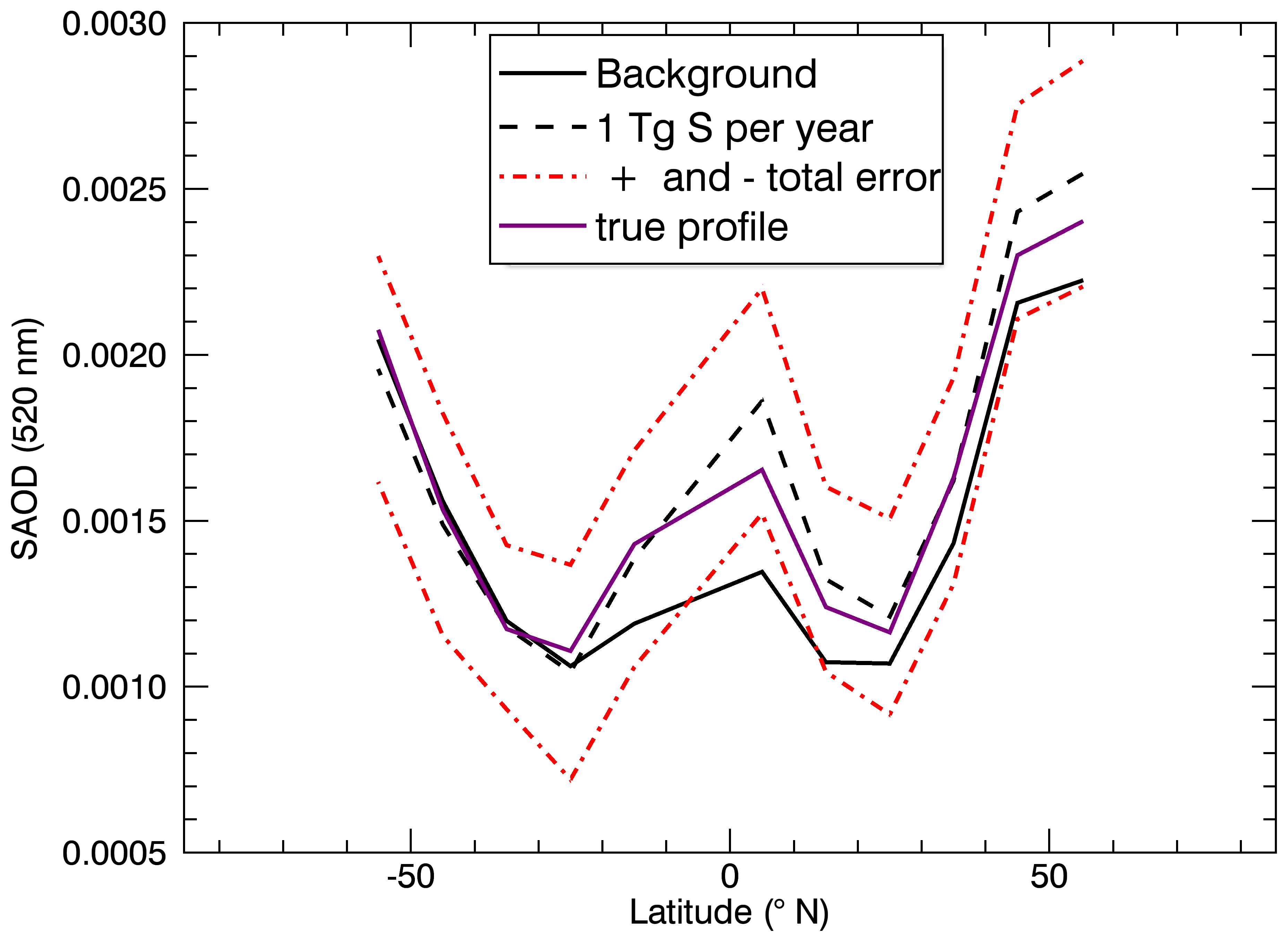 The basic idea is that the artificial aerosol enhancement is observable in a certain altitude range if the background profile is outside the error range of the extinction profiles of 1 and 2 Tg S yr−1 (red dashed lines in Figs. 4 and 5). This means that the change due to the additional emissions of 1 or 2 Tg S yr−1 is large enough to be distinguishable from the background. For 1 Tg S yr−1 (Fig. 4), this is the case for 65° N in January and July (upper panels) from ≈10–22 km, for 15° N in January and July (middle panels) from ≈14–27 km, and for 65° S in January and July (lower panels) from ≈10–22 km. Note that only a part of the results at different latitudes are shown here, 65° N, 15° N, and 65° S. For 2 Tg S yr−1 (Fig. 5), the artificial aerosol enhancement is observable for 65° N in January and July (upper panels) from 10–24 km, for 15° N in January and July (middle panels) from ≈13–27 km, and for 65° S in January from ≈10–23 km and in July from ≈10–21 km (lower panels). In both cases, i.e. 1 and 2 Tg S yr−1, it is possible to observe these emissions for the latitudes and months shown here. In the following, the stratospheric aerosol optical depth (SAOD) at 520 nm and the corresponding total error were determined. To calculate the SAOD, the latitude-dependent tropopause heights from SAGE II data (2002–2004) for January (2002) and July (2004 – due to the lack of latitude coverage in 2002 and 2003) were used (NASA, 2012), which is why only latitudes from 55° S to 55° N can be shown here. The upper limit remains at 27 km, corresponding to the altitude range of the given aerosol extinction coefficients (see Sect. 2.1). The total error for the SAOD was calculated using Gaussian error propagation. Figure 6 shows results for latitudes from 55° S to 55° N for January (left column) and July (right column), with 1 Tg S yr−1 (upper panels) and 2 Tg S yr−1 (lower panels), including the corresponding total errors, background cases, and true profiles (ECHAM simulation results).