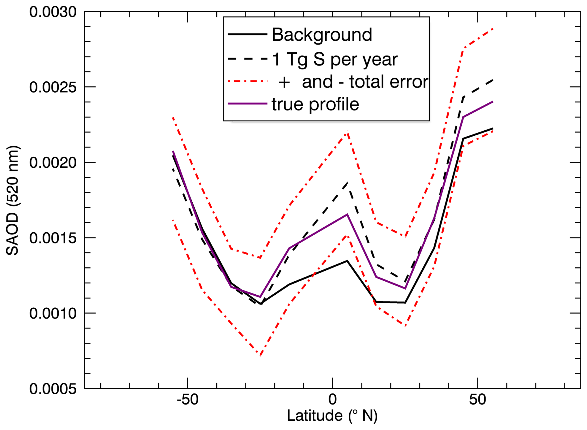 Figure 8SAOD (520 nm) over latitude (° N) for 1 Tg S yr−1 in January in the first year of the initial phase, including the corresponding total errors, the background case, and the true profile (ECHAM simulation results).