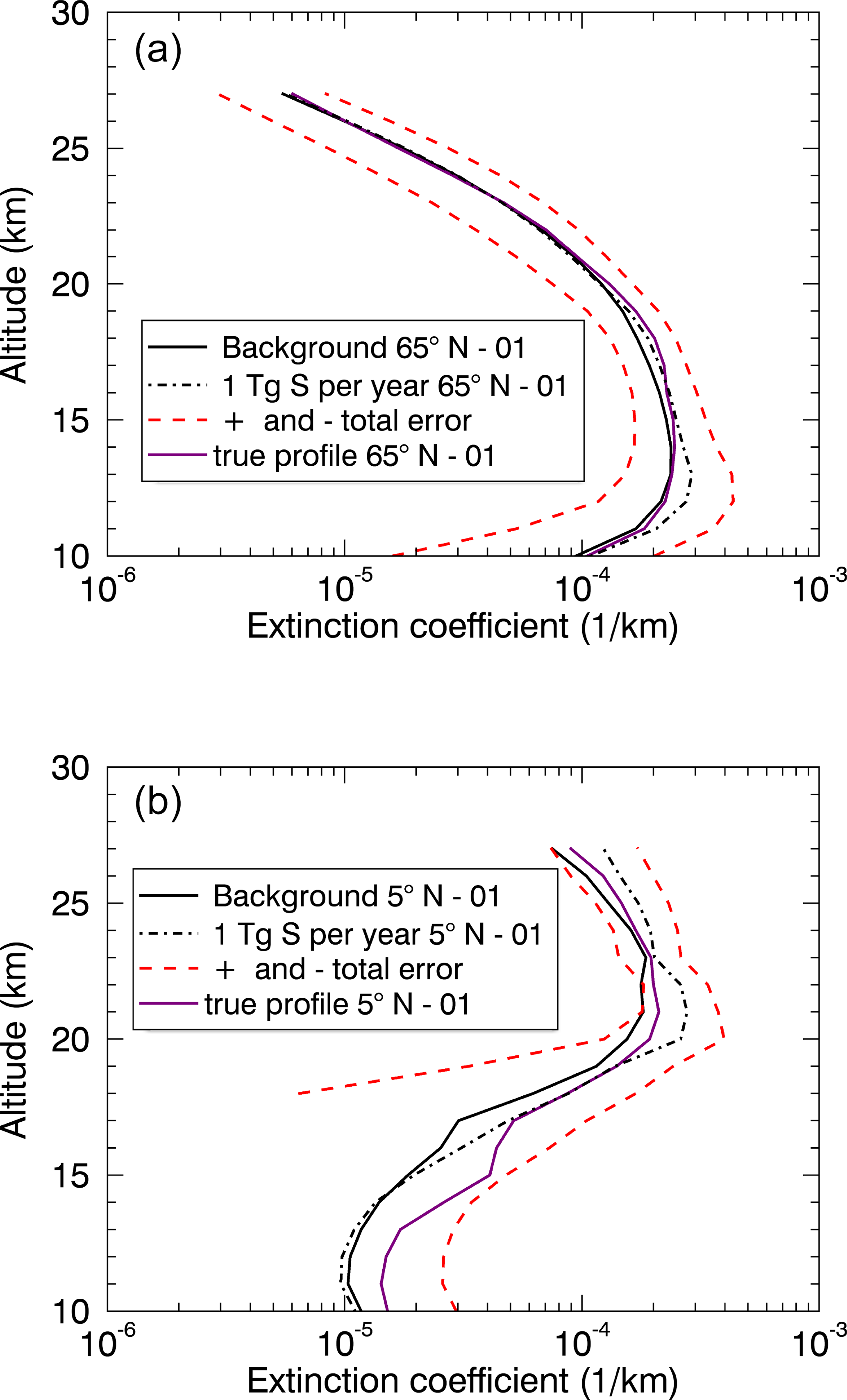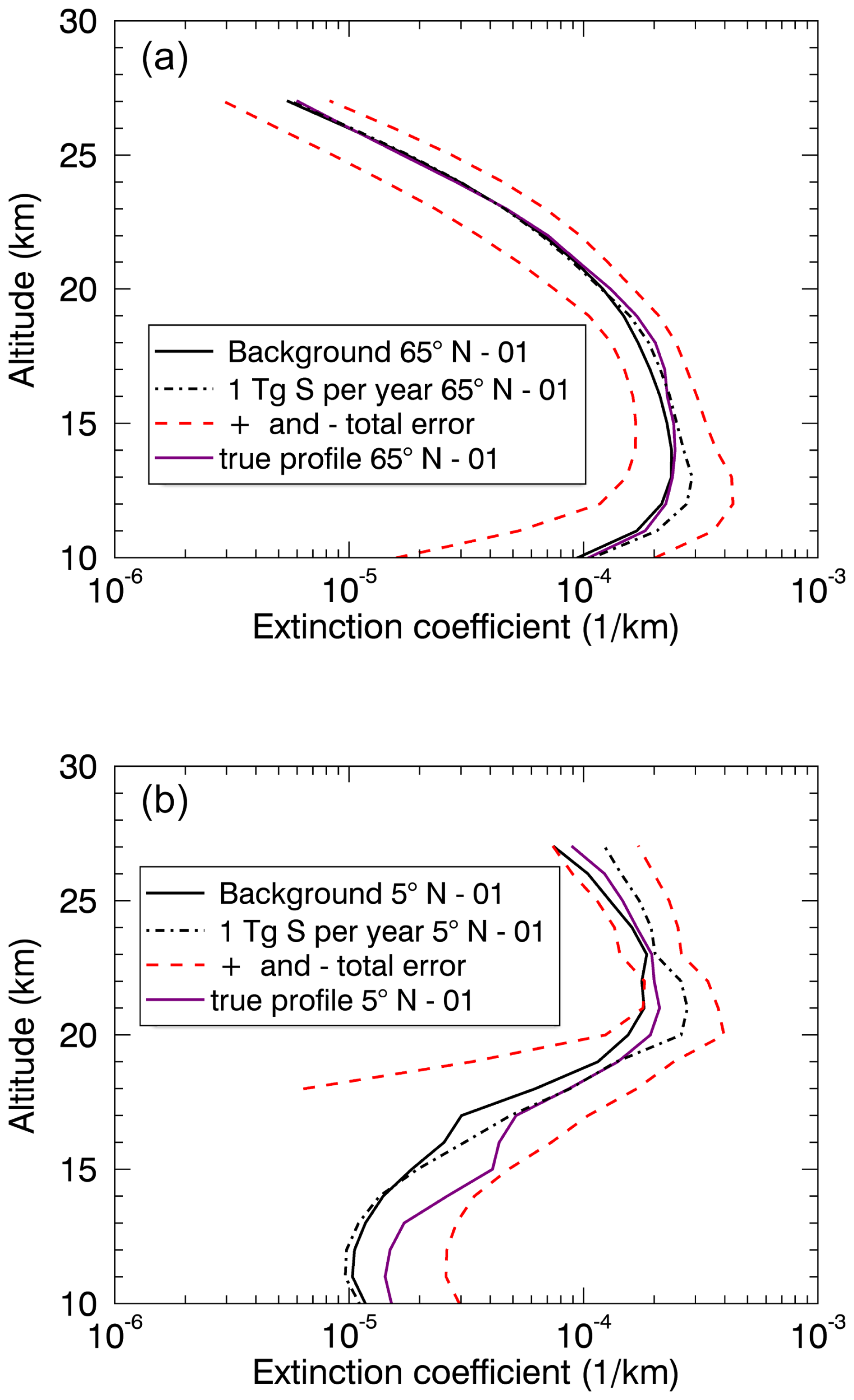 Figure 9Retrieved aerosol extinction profiles at 520 nm for 1 Tg S yr−1, January, 65° N (a), and 5° N (b), including total errors, background profiles (520 nm), and true profiles (520 nm) (ECHAM simulation results).