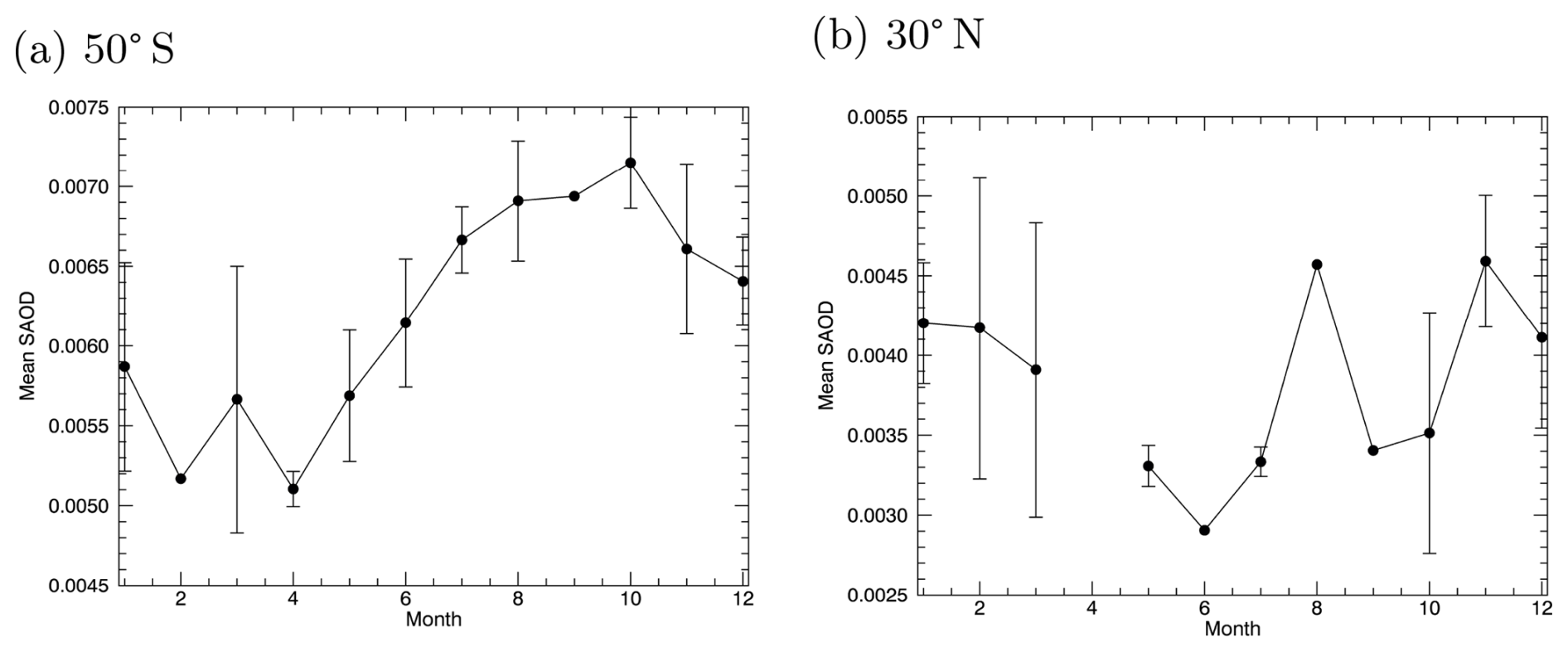 Figure 10Mean SAOD (525 nm) over month for the SAGE II data from 2002–2004. The vertical bars indicate the standard deviation of the SAOD values for each month. Illustrated for 50° S (a) and 30° N (b).