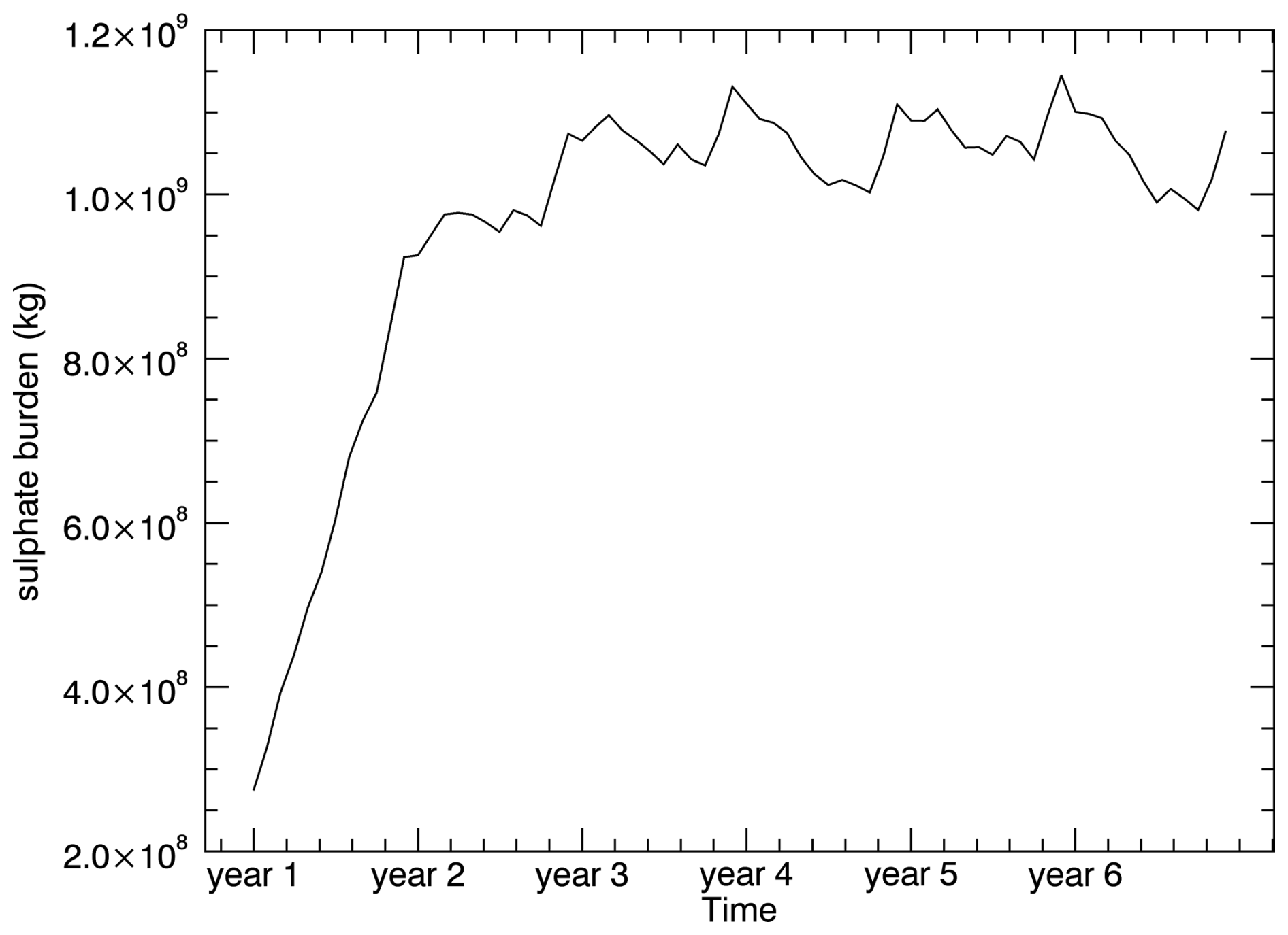 Figure A1Monthly mean sulfate burden (in kg) over time (2005–2010) for 1 Tg S yr−1, showing the differences between the 2-year initial phase and the quasi-steady-state phase.